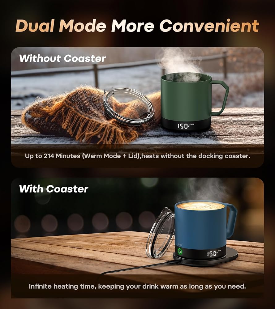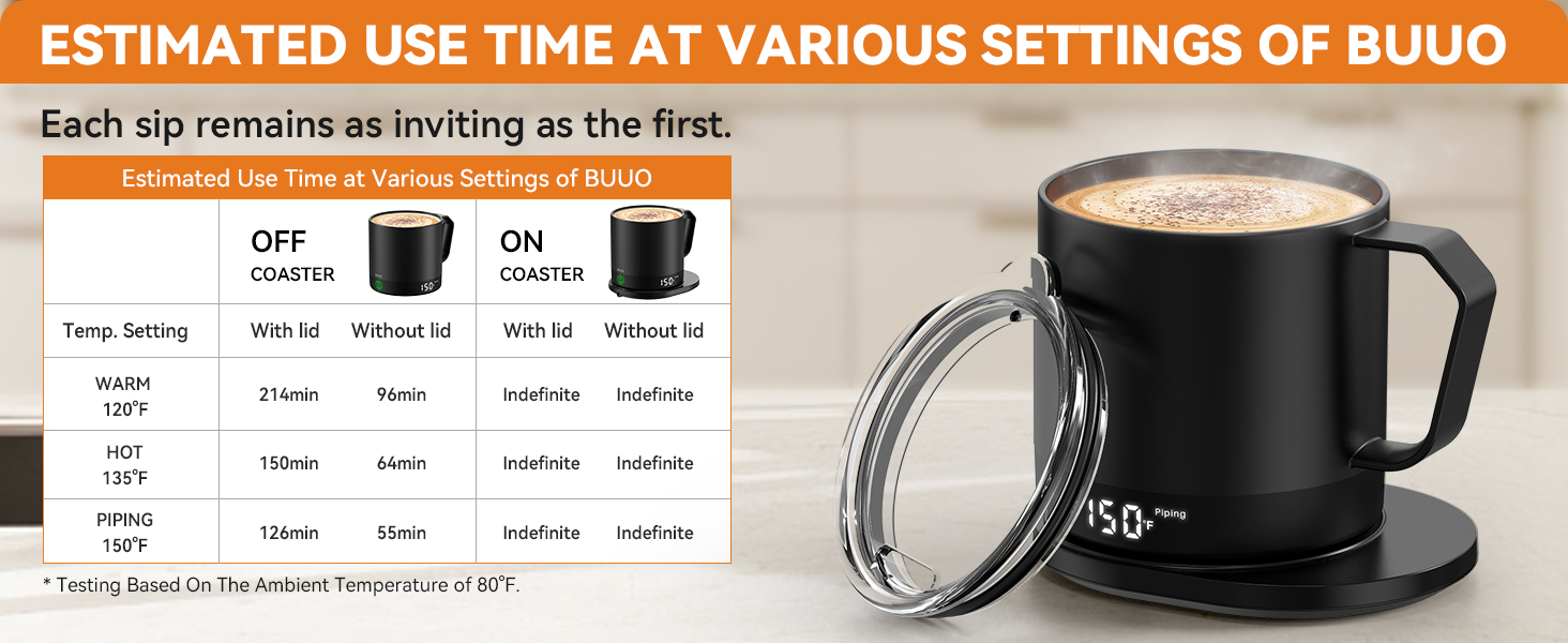 • أداء بطارية طويل الأمد: بطارية الليثيوم المدمجة بقدرة 2550 مللي أمبير في الساعة تمكن الكوب من الحفاظ على درجة حرارة 150 درجة فهرنهايت لمدة تصل إلى 126 دقيقة بعد الشحن الكامل؛ استمتع بالمشروبات الساخنة أثناء الاجتماعات الطويلة أو أثناء العمل دون الحاجة إلى إعادة شحن طاقتك بشكل متكرر. واستخدمه مع قاعدة الشحن للحصول على الدفء طوال اليوم.