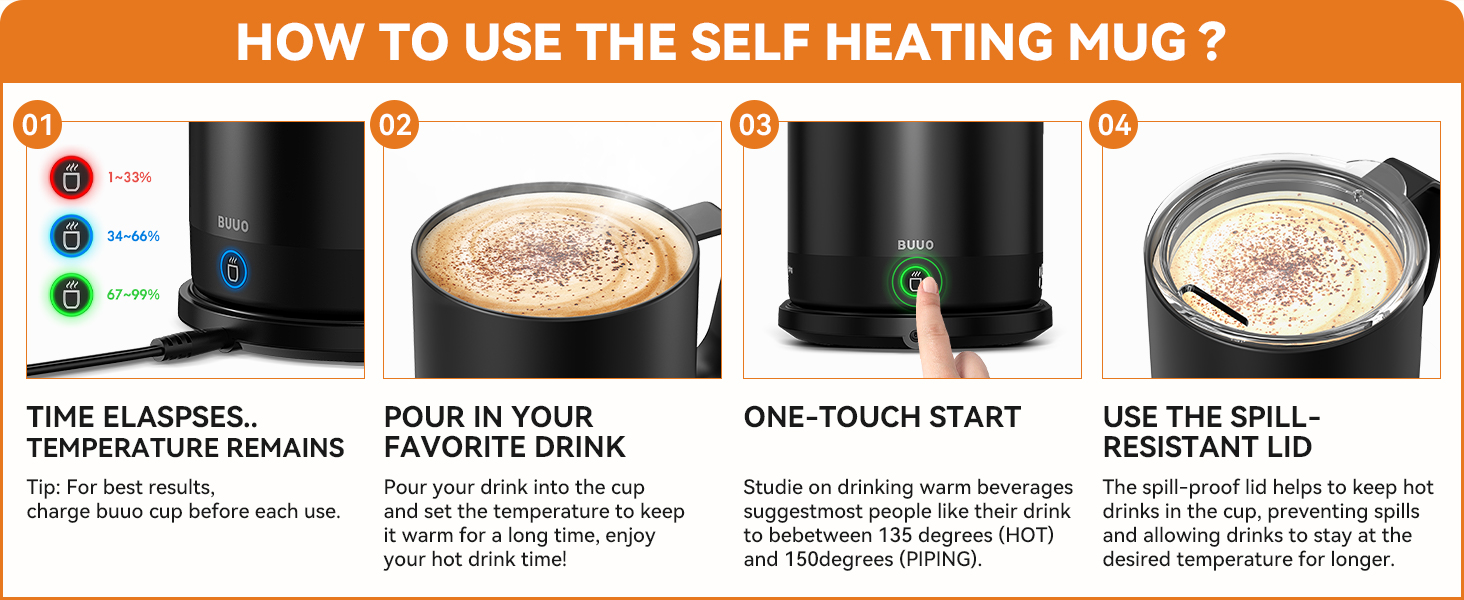 • الهدية المدروسة: اسعد أصدقائك وعائلتك بكوب القهوة Buuo ذاتي التسخين، المصمم للحفاظ على مشروباتهم المفضلة في درجة حرارة مثالية. في المنزل أو المكتب أو أثناء التنقل، كل رشفة دافئة وممتعة.