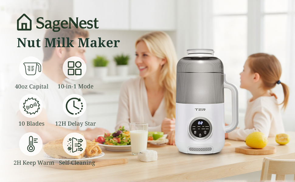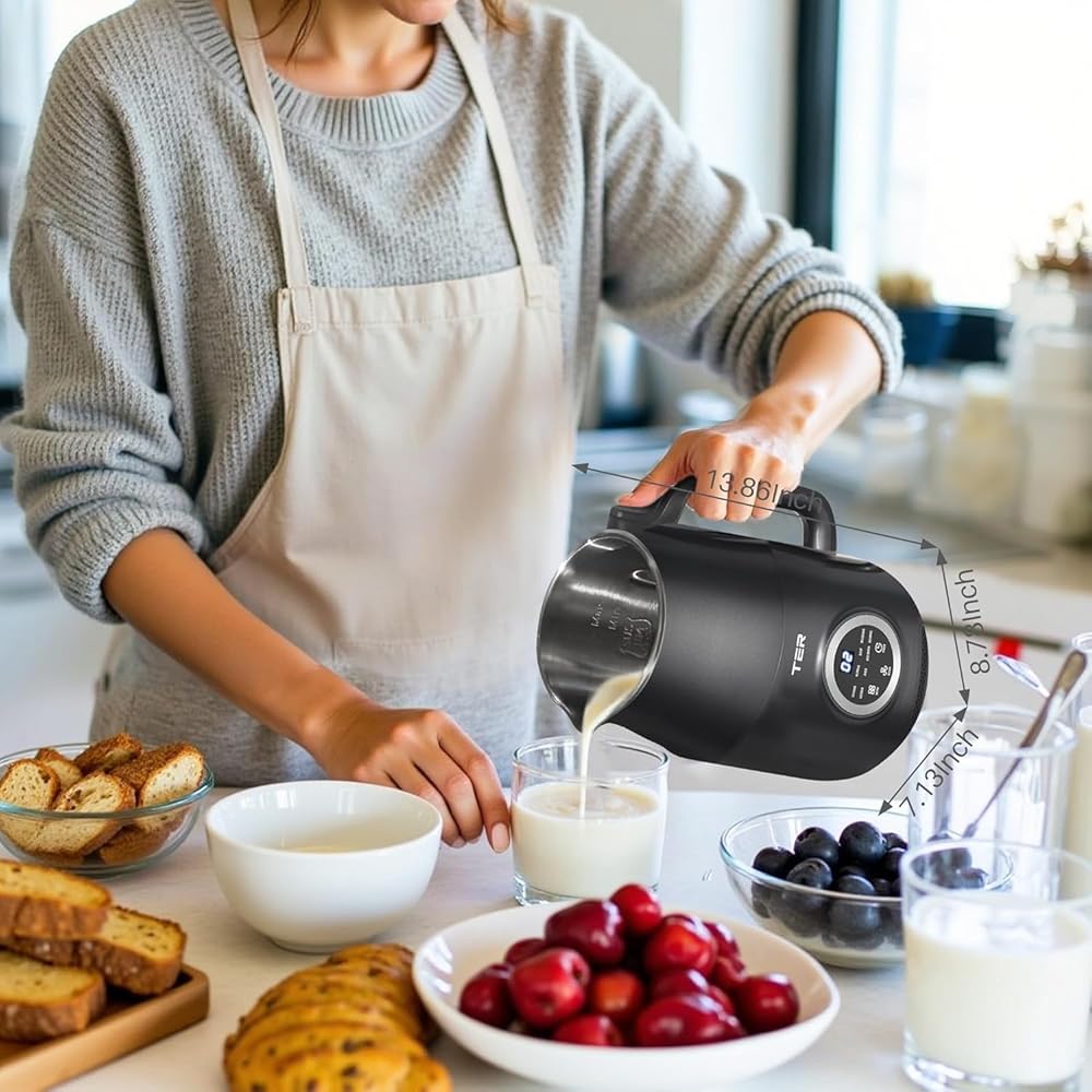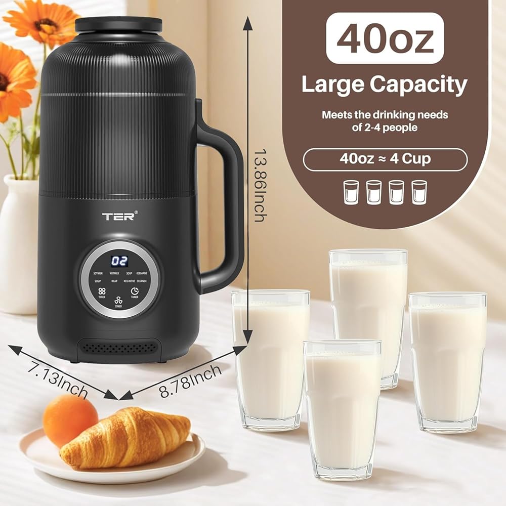 【40oz Large Capacity】This Nut Milk Machine has a large capacity design, upgraded to 40 OZ. It can make about 4 cups of drinks at once, perfect for family use—just enjoy fresh homemade milk with your loved ones.