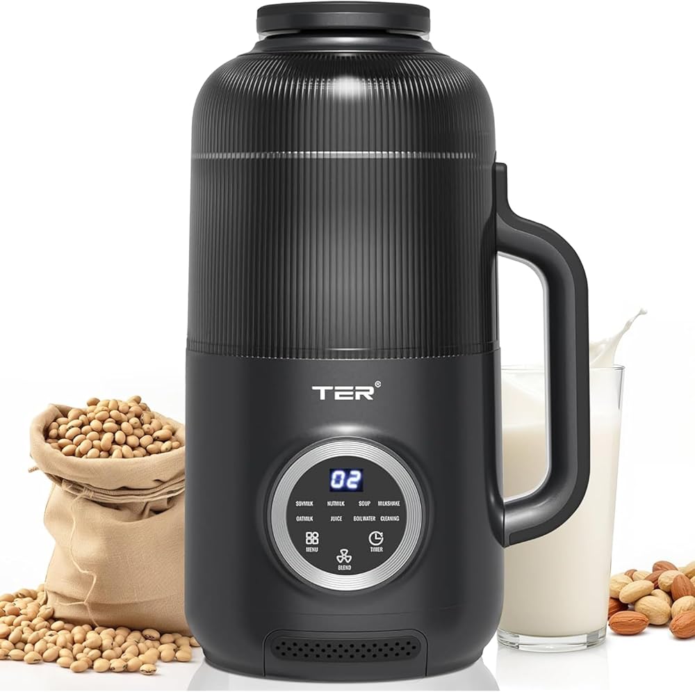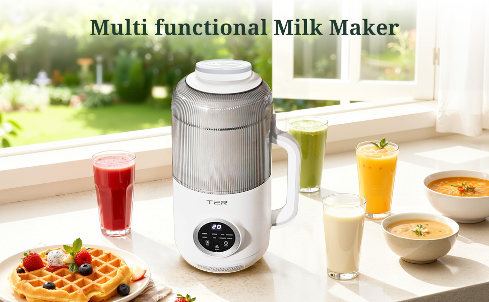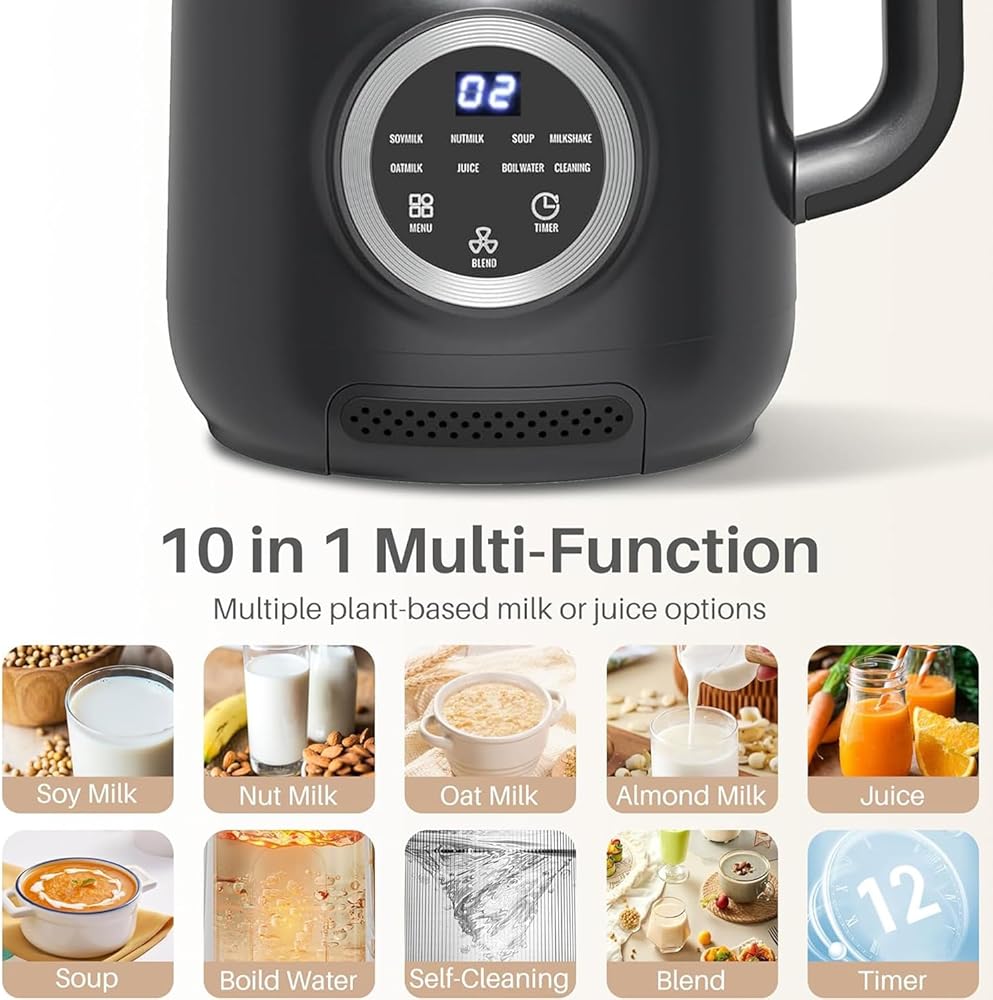 【10-in-1 Multifunctional】No pre-soaking required! This versatile Nut Milk Maker also works as a soy milk maker, effortlessly making nut milk, soy milk, milkshakes, oat milk, rice paste, tea, and even squeezing juice or boils water—meeting all your daily beverage needs conveniently.