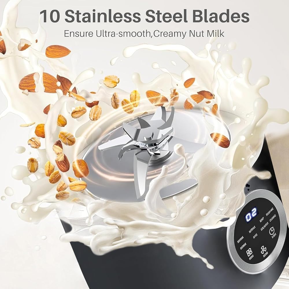 【10-Blade Cutter & Ultra-Quiet Design】10-blade stainless steel X-cutter blends and heats nuts quickly, creating smooth, sediment-free milk. With soundproof cover and shock-absorbing feet, it runs at only 50dB—30% quieter than traditional ones.