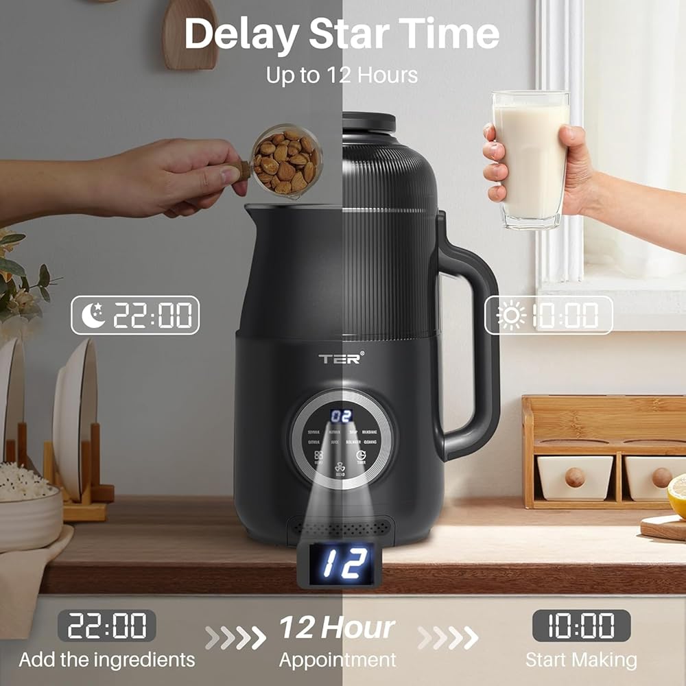 【12-Hour Delay Start + 2-Hour Keep Warm】This nut milk maker machine has 12-hour delay start and 2-hour keep warm functions. Set it before bed, and wake up to fresh, warm almond milk—no cold drinks or repeated heating, saving your precious morning time.