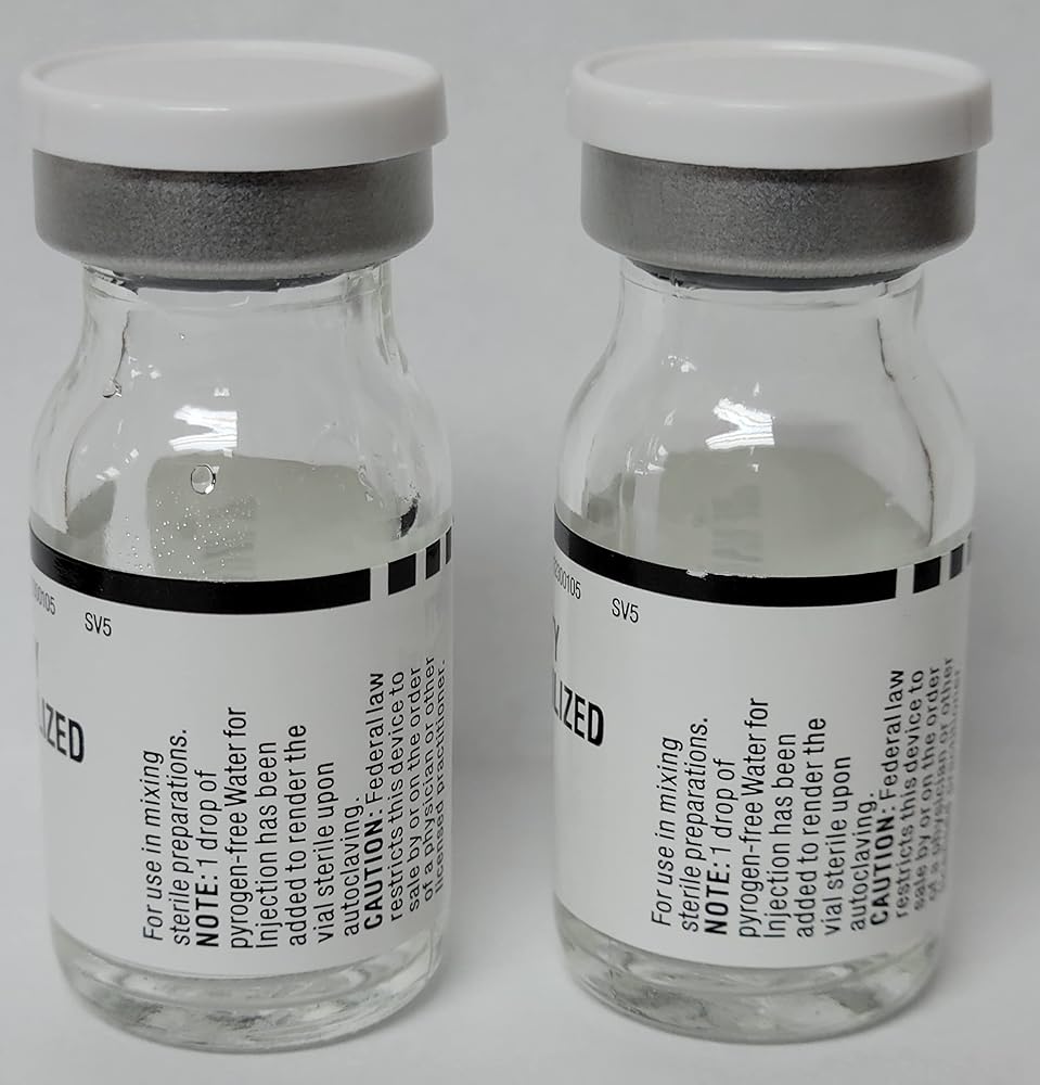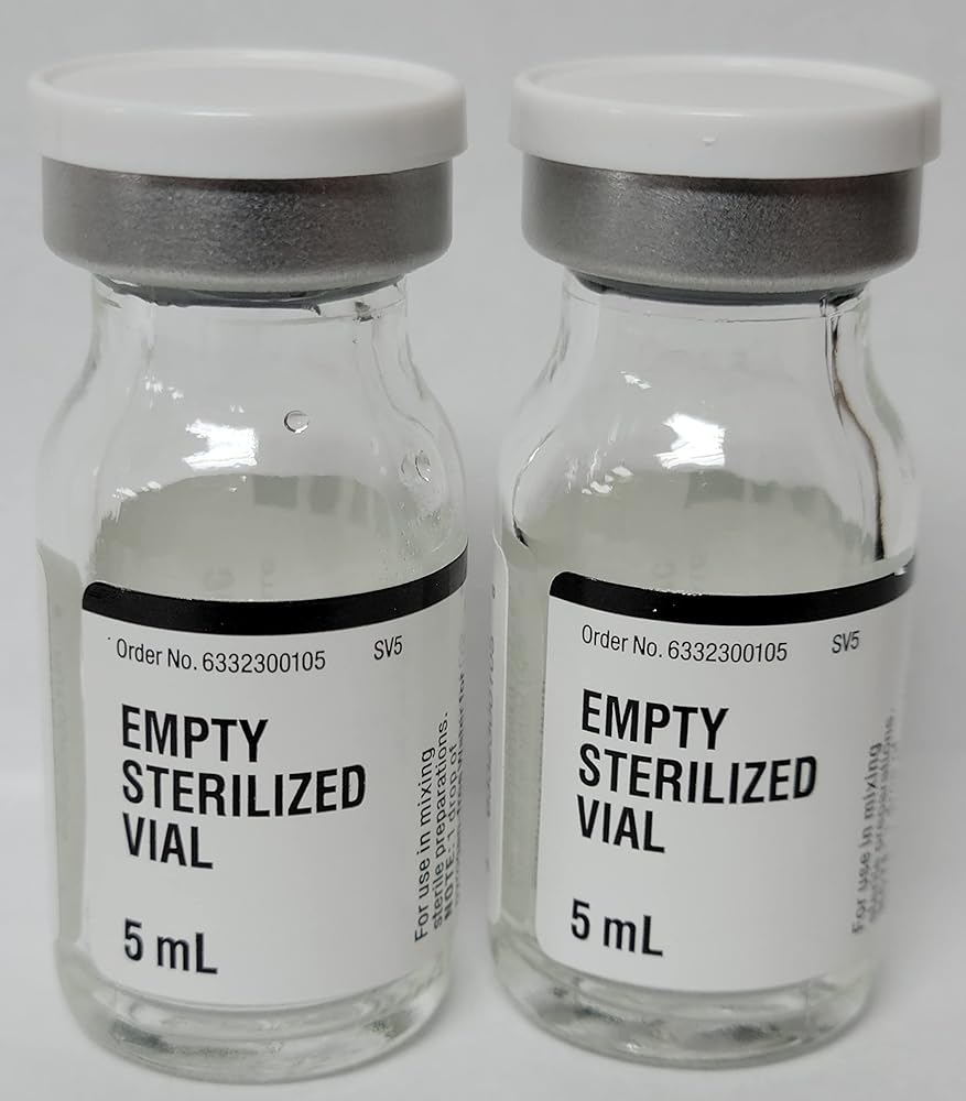 2 قارورة فارغة معقمة سعة 5 مل مع غطاء أبيض (تحتوي على قطرة واحدة من الماء الخالي من البيروجين للحقن، القارورة معقمة)