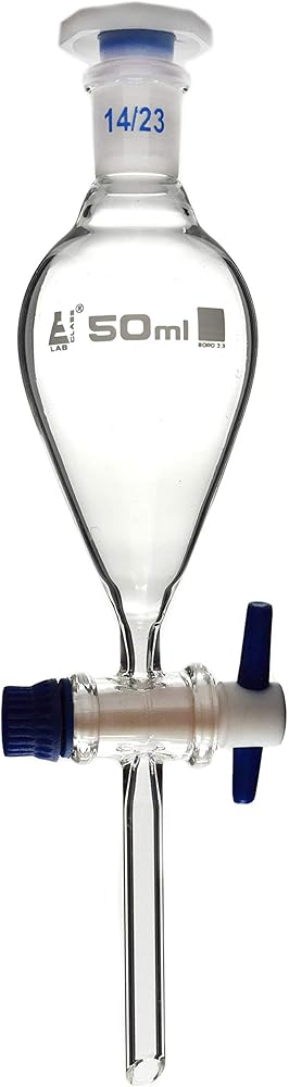 قمع سكويب منفصل، مصنوع من زجاج البورسليكات عالي الجودة، سعة 50 مل، غير متدرج. سدادة بلاستيكية قابلة للتبديل من PTFE، مقاس المقبس 14/23 بطول 8 بوصة وعرض 2.25 بوصة وسعة 50 مل، قمع فصل على شكل كمثرى، مصنوع من زجاج البورسليكات عالي الجودة. يحتوي القمع على مقبس مقاس 14/23 ويشتمل على سدادة بلاستيكية قابلة للتبديل. محبس مفتاح PTFE. غير متخرج. يبلغ طول هذا القمع حوالي 8 سم وعرضه 2.25 سم. يبلغ قطر الرقبة حوالي 0.6 بوصة. يحتوي زجاج Eisco Labs Borosilicate على درجات تحمل الحرارة التالية: نقطة الضغط -515 درجة مئوية | نقطة التلدين 565 درجة مئوية | نقطة التليين 820 درجة مئوية.