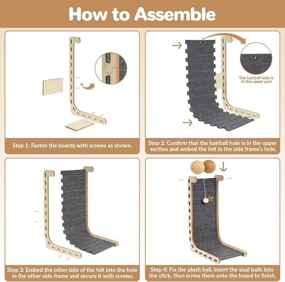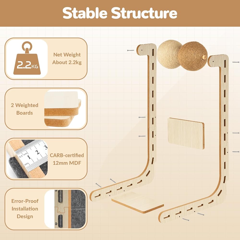 ترقية البناء: تتميز حصيرة الخدش للقطط Nxwjoy بفجوة 10 سم لاستيعاب حواف الحائط. مصنوع من خشب MDF مقاس 12 مم معتمد من CARB، ويزن هيكله القوي حوالي 2.2 كجم، مما يضمن ثبات القطط البالغة أثناء الاستخدام. تمت ترقية التصميم المقاوم للأخطاء إلى مفاصل اللوحة لمنع أخطاء التثبيت، والمواد المطورة تقاوم الضرر الناتج عن التجميع والتفكيك المتكرر.