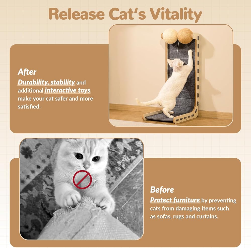إطلاق حيوية القطط: هذا عبارة عن واقي أثاث للخدش للقطط حيث أن كلا من سطح الخدش أو كرات السيزال جيدة لصحة أظافر قطتك، كما أن متانتها وثباتها يجعلها أكثر إرضاءً وأمانًا لقطتك لتمتد وتخدش محتوى قلبها مع منع تلف الأثاث الخاص بك. يمكن أن تتناسب أداة خدش القطط هذه بسهولة مع أي مساحة، بدءًا من غرفة المعيشة وحتى غرفة النوم أو المرآب، مما يخلق ملاذًا مثاليًا لقطتك.