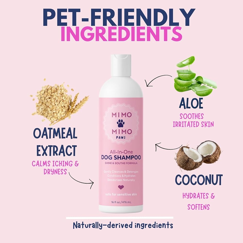 Turn bath time into a gentle spa experience with MIMO MIMO PAWS Naturally-Derived All-in-One Dog Shampoo. This plant-based, moisturizing formula cleanses, detangles, and hydrates — perfect for dogs with sensitive skin. Infused with coconut and oat extract, it soothes dryness and itching while leaving the coat soft, shiny, and easy to brush. Free from sulfates, phosphates, alcohol, and parabens, this Made-in-USA dog shampoo provides a naturally deodorizing, conditioning clean without irritation or residue. Simply wet your dog's coat, lather, and rinse for a fresh, silky finish that keeps every pup looking and feeling their best.