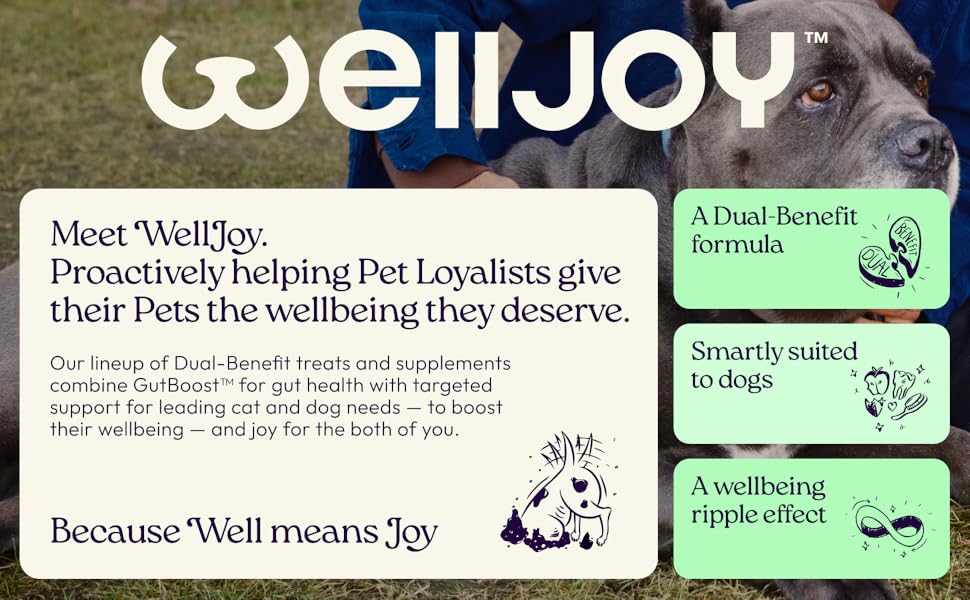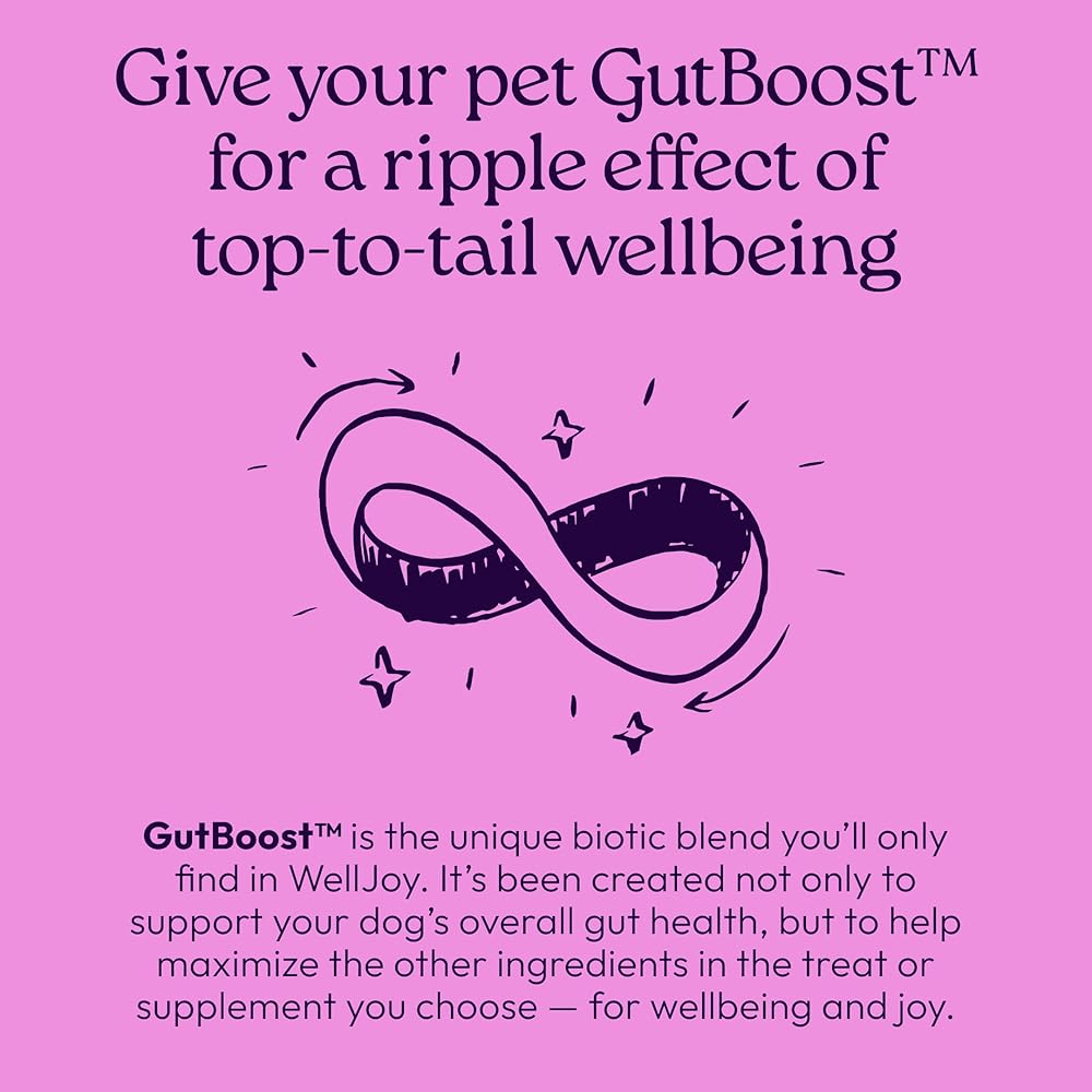 Why WellJoy: Every WellJoy treat and supplement includes GutBoost in every bite making it the smart, simple – and scrumptious – way to boost your dog's top-to-tail wellbeing – and joy!