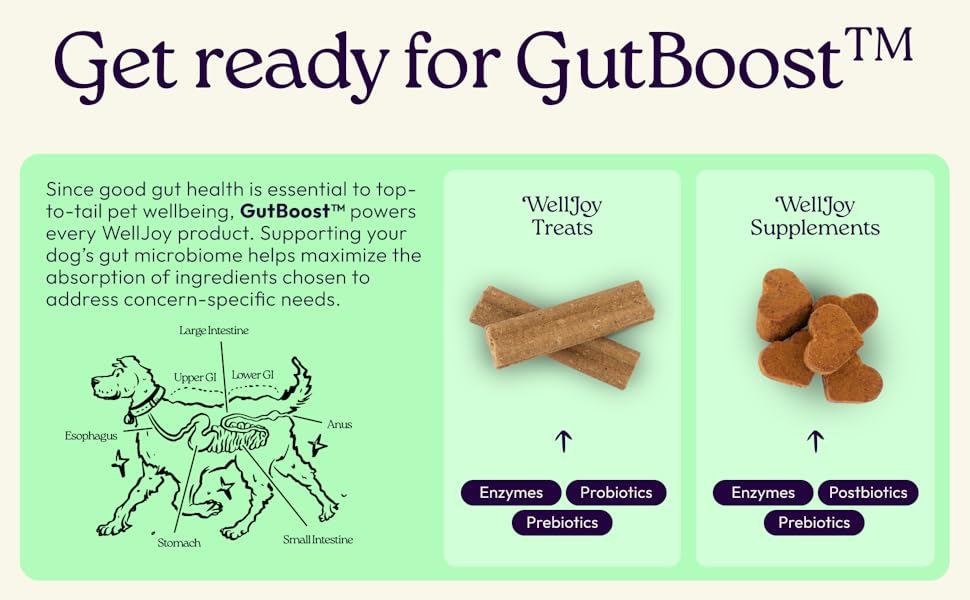 GutBoost: Our vet-formulated GutBoost biotic blend targets both upper and lower GI tract health, to support the health of your dog's gut microbiome, with enzymes, prebiotics and postbiotics in all of our supplements.