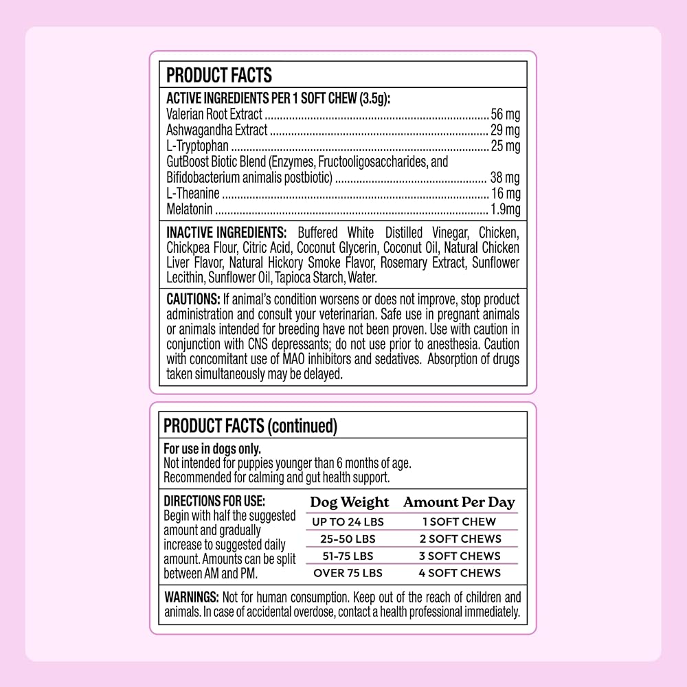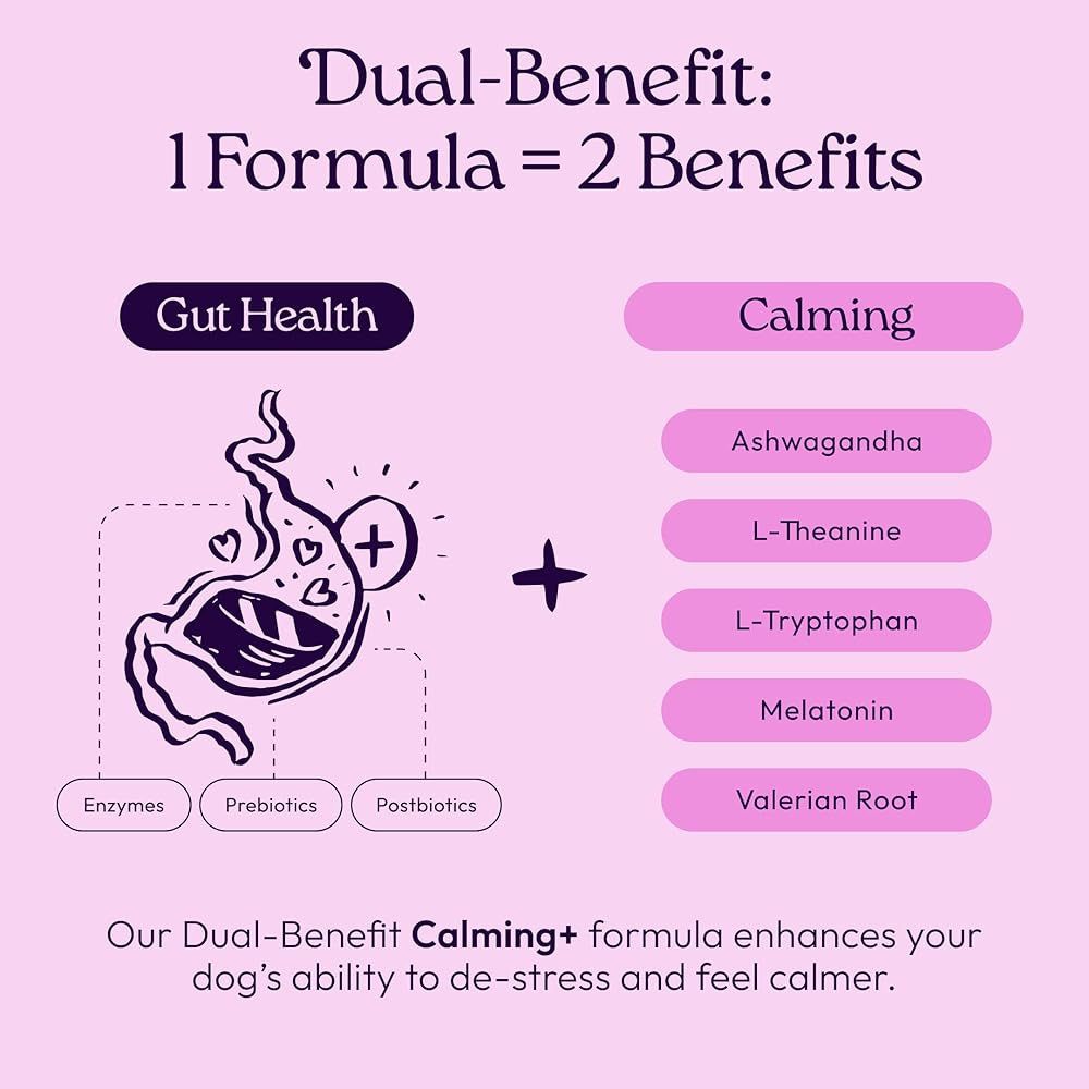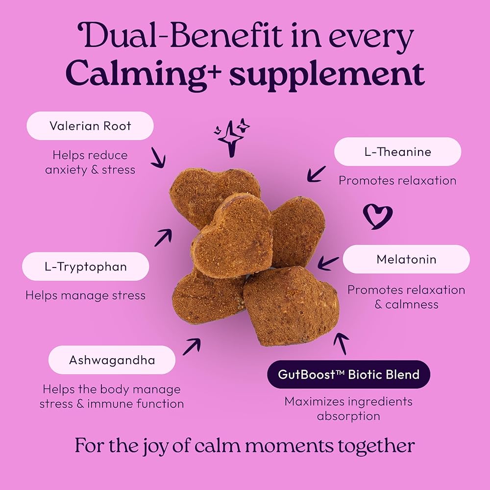 Calming+ Dog Supplement: This calming supplement helps manage normal stress levels, reducing anxiety from using Valerian Root Extract. Calming+ also promotes relaxation & calmness thanks to L-Theanine & Melatonin, along with GutBoost in every bite.