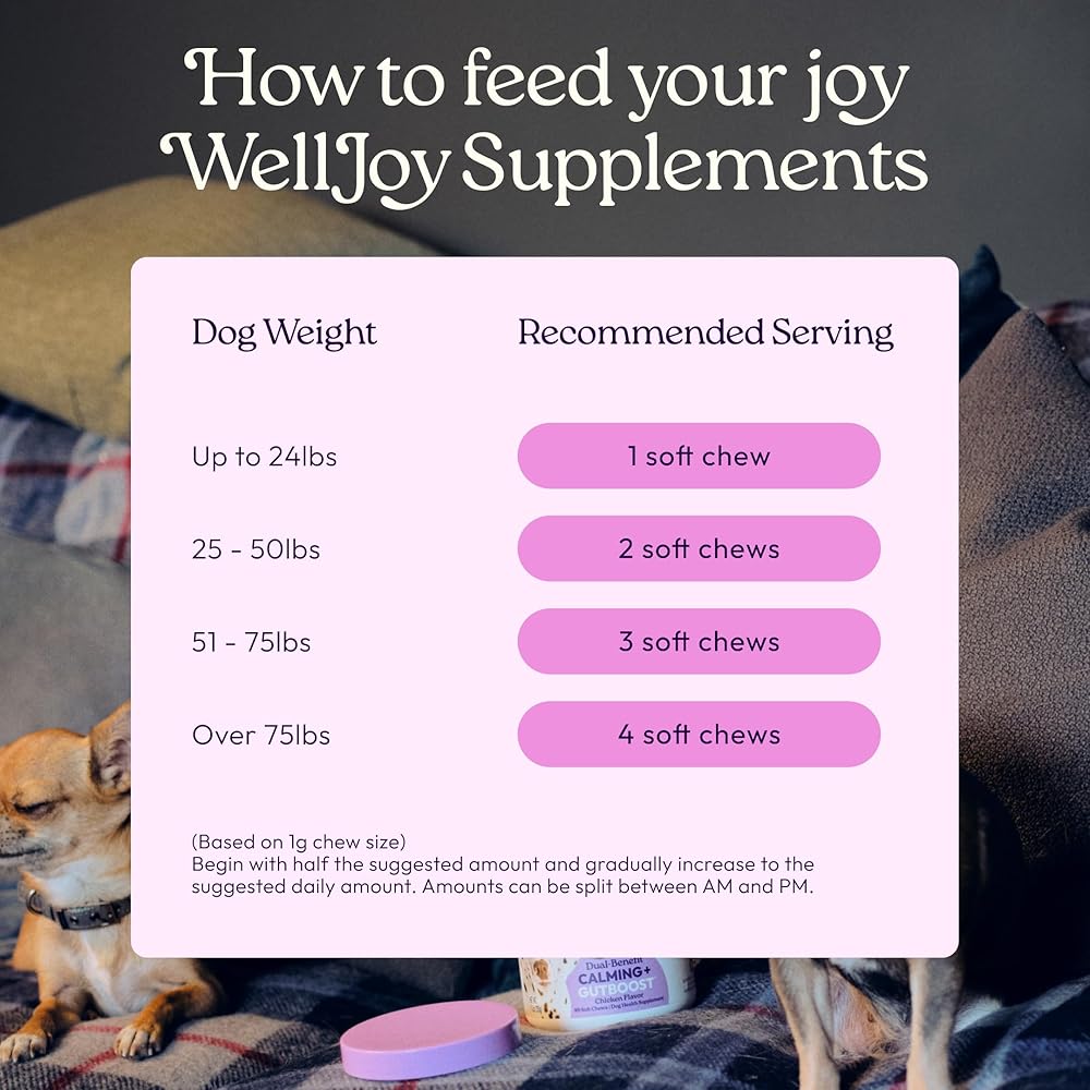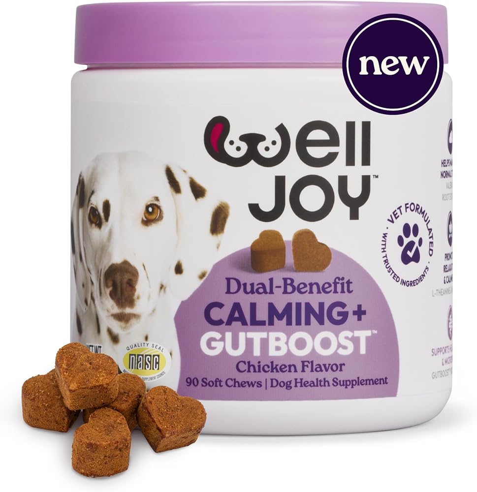 Your dog's contentment means more joy! We know that a relaxed dog is a happy dog. Make this supplement part of your dog's routine for less stress, and more joy — for both of you. Our dual-benefit Calming+ formulation enhances your dog's ability to de-stress and feel calmer. Our signature GutBoost™ biotic blend powers up a vet-formulated formulation of Valerian Root, Ashwagandha, L-Tryptophan and Melatonin — for the joy of a more peaceful pet household. Make these part of your pet's daily routine for a boost of wellbeing — and joy! Well means Joy