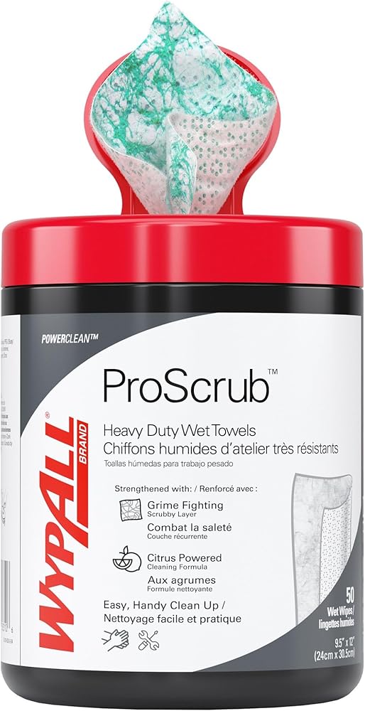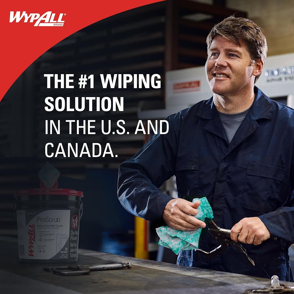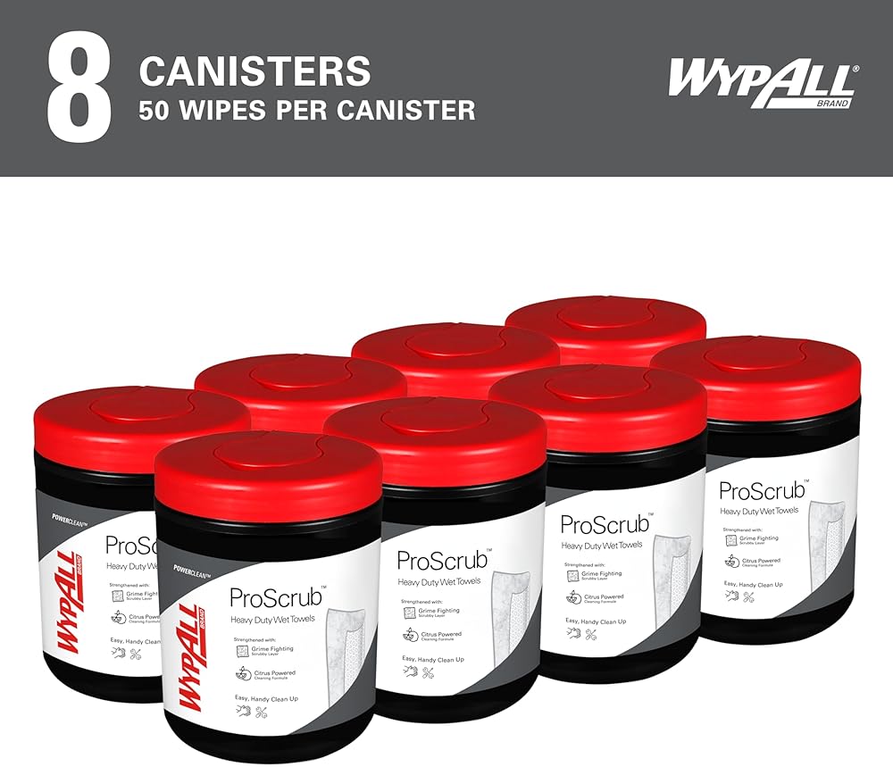 - 50 ورقة/علبة؛ 8 علب من المناشف المبللة شديدة التحمل من WypAll PowerClean ProScrub؛ 400 ورقة/حالة؛ مناديل مبللة كبيرة جدًا مقاس 9.5 بوصة × 12 بوصة؛ تنظيف مزدوج المفعول؛ وشملت العلبة