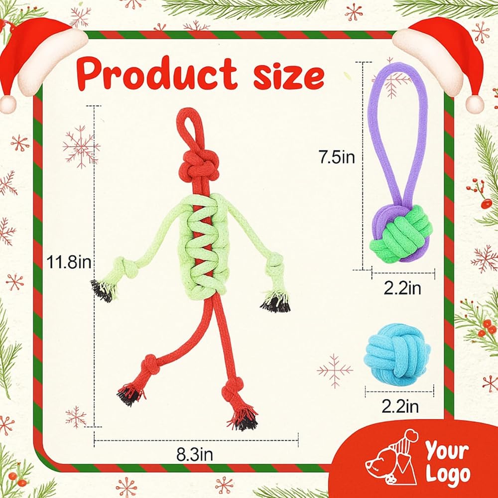 • Christmas Dog Rope Toys Package: the package includes 6 colorful Christmas knotted human toys, 3 knotted handle ball toys, and 3 toy balls, providing a sufficient quantity for diverse play; Use the knotted human toys for teething relief, the knotted handle ball toys for bonding games, and the toy balls for play; This assortment allows for various activities, keeping your dog engaged and entertained while reducing boredom and destructive behavior,It's the ideal Christmas gift for your dog