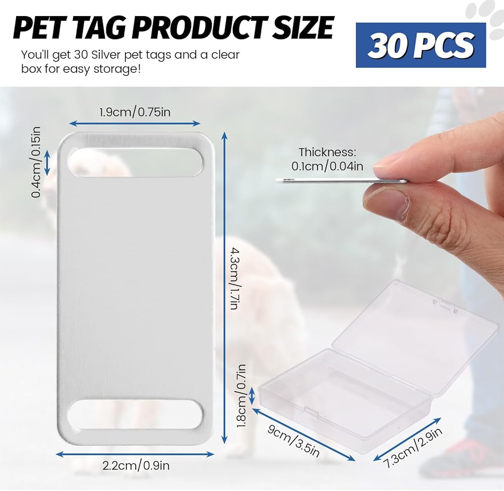 Bulk Value Pack: Contains 30 blank dog tags for engraving in black and 1 transparent box for easy storage