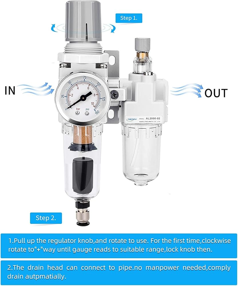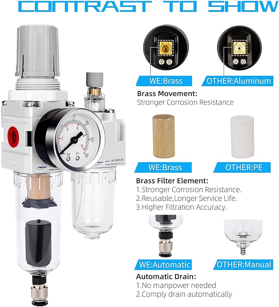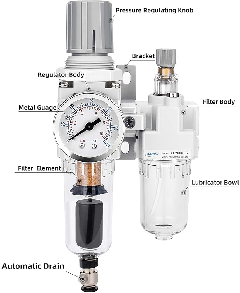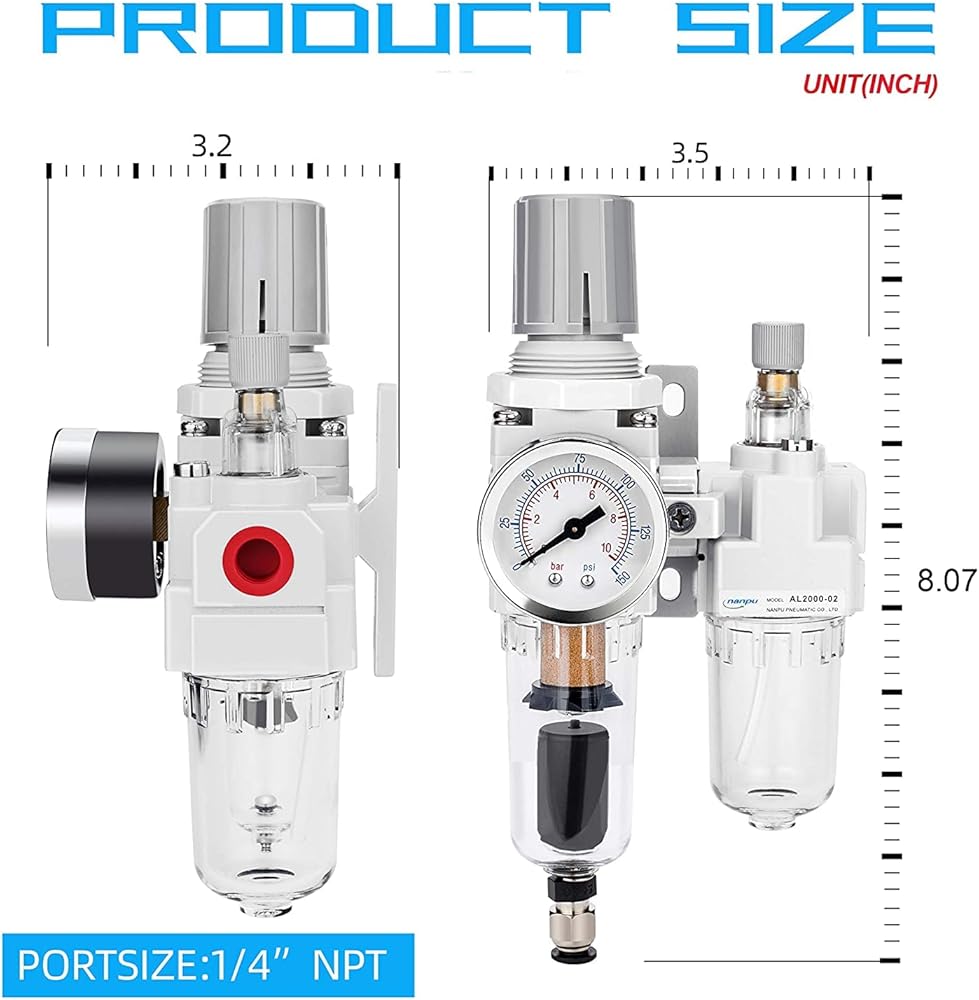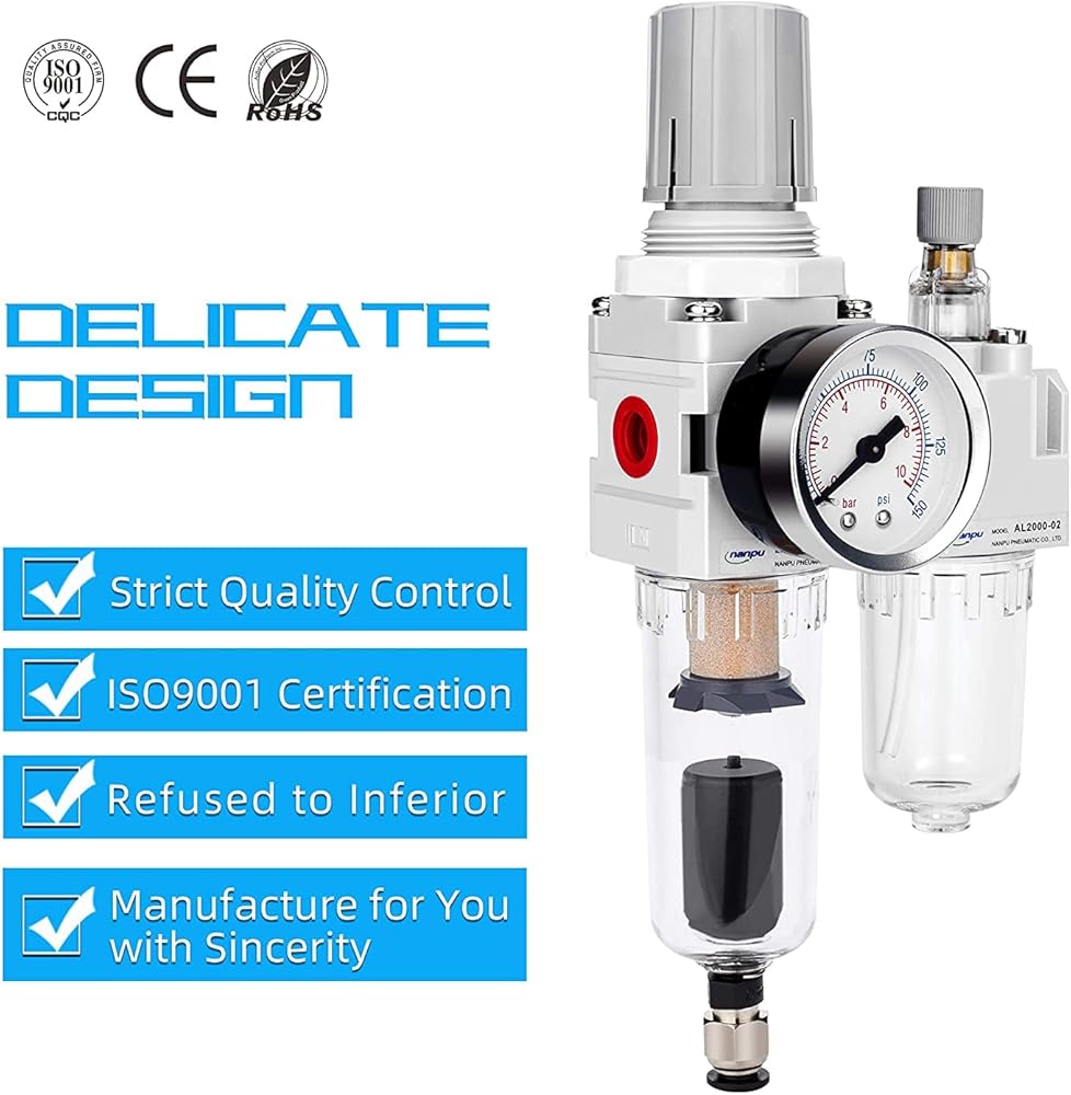 NANPU 1/4" NPT منظم فلتر الهواء التلقائي مجموعة التشحيم (FRL) فاصل مصيدة الماء/الزيت - مقياس (0-150 رطل لكل بوصة مربعة)، عنصر نحاسي 5 ميكرون، وعاء بولي، دعامة معدنية