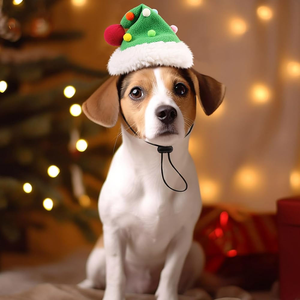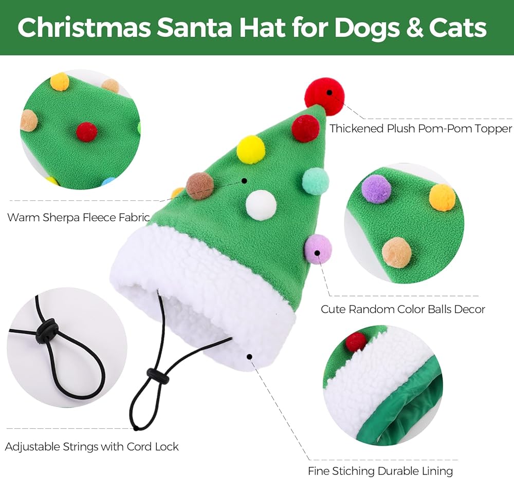 الميزات: تم تجهيز قبعة سانتا للحيوانات الأليفة بحزام آمن لضمان ملاءمة محكمة حول رأس كلبك، وإبقائها في مكانها ولن تسقط أثناء اللعب أو المشي أو الأنشطة الاحتفالية. يضيف تصميم شجرة عيد الميلاد الفريد، المزين بكرات صغيرة ملونة بشكل عشوائي، لمسة خاصة للعطلات في موسم عيد الميلاد.