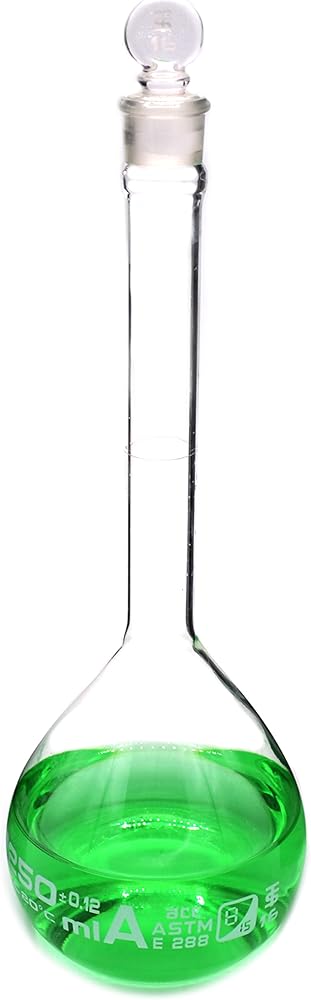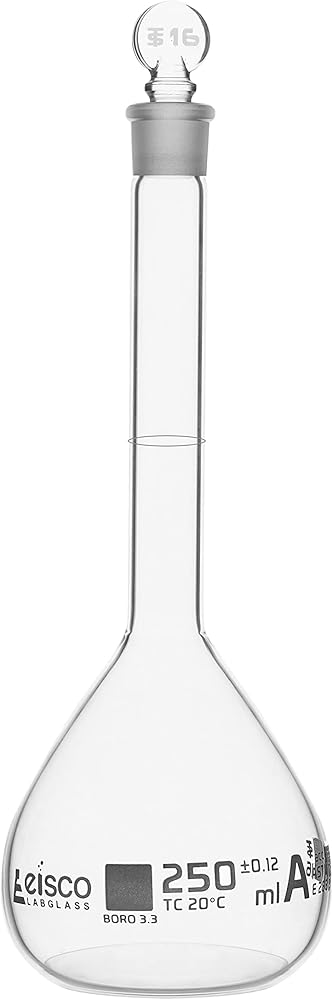 دورق حجمي، 250 مل - الفئة أ، ASTM - التسامح ±0.120 مل - سدادة زجاجية - مفرد، تخرج أبيض - Eisco Labs