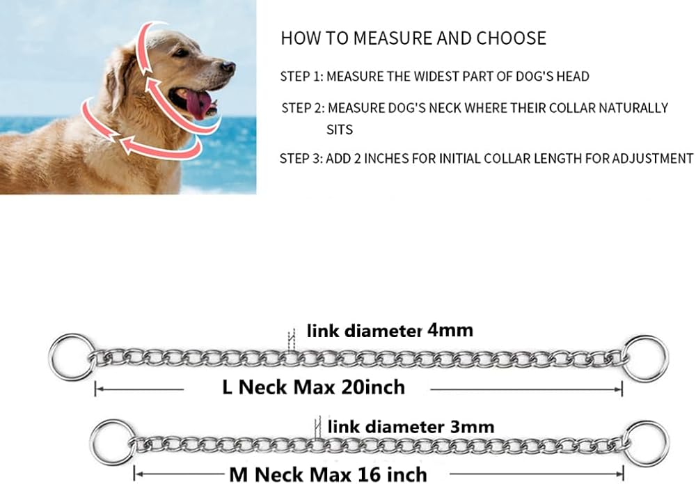 [Size:] M Length 20-inch for dog's neck max 16-inch, link diameter 3mm. L Length 24-inch for dog's neck max 20-inch, link diameter 4mm.