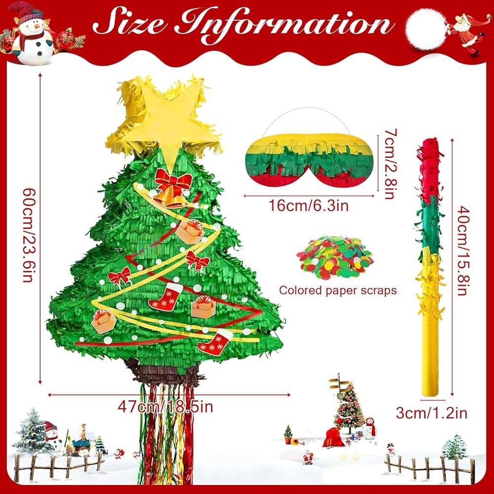• معلومات المقاس: يبلغ مقاس بينياتا شجرة الكريسماس 60 × 45 × 6.5 سم/23.6 × 17.7 × 2.56 بوصة، ويبلغ طول الخفاش حوالي 40.2 سم/ 15.8 بوصة، وهو مناسب لحمل الحلوى والشوكولاتة والهدايا الصغيرة وغيرها من الملحقات الصغيرة.