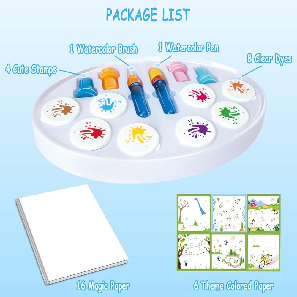 【Color Paint Set】Includes 1 paintbrush, 1 drawing pen, 8 vibrant paints, 4 cute stamps, 6 sheets of colored paper, and 16 magic drawing sheets for a complete creative experience.
