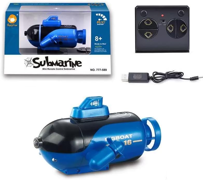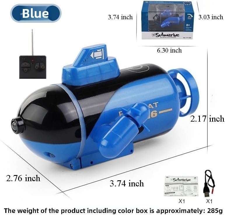Dive into aquatic adventure with this radio-controlled submarine toy that brings underwater exploration to life. This sleek, gray-blue submarine model measures approximately 7.9 x 5.1 x 5 inches and features detailed construction with authentic styling. The easy-to-use remote control system offers intuitive directional navigation through arrow buttons, while the LED light in the nose adds realistic effect during operation. The set includes everything needed to get started: the submarine unit, remote controller, charging cable, antenna, and comprehensive instruction manual. The submarine's total package weighs 265g, making it substantial enough for stable underwater performance while remaining easily portable. Perfect for both indoor pools and outdoor water play, this RC submarine provides hours of entertainment for children and hobby enthusiasts alike. The durable plastic construction ensures long-lasting performance, while the USB charging capability offers convenient power replenishment. Note that batteries are required but not included, and adult supervision is recommended for younger operators. This toy submarine combines realistic military styling with user-friendly controls to create an engaging aquatic play experience.