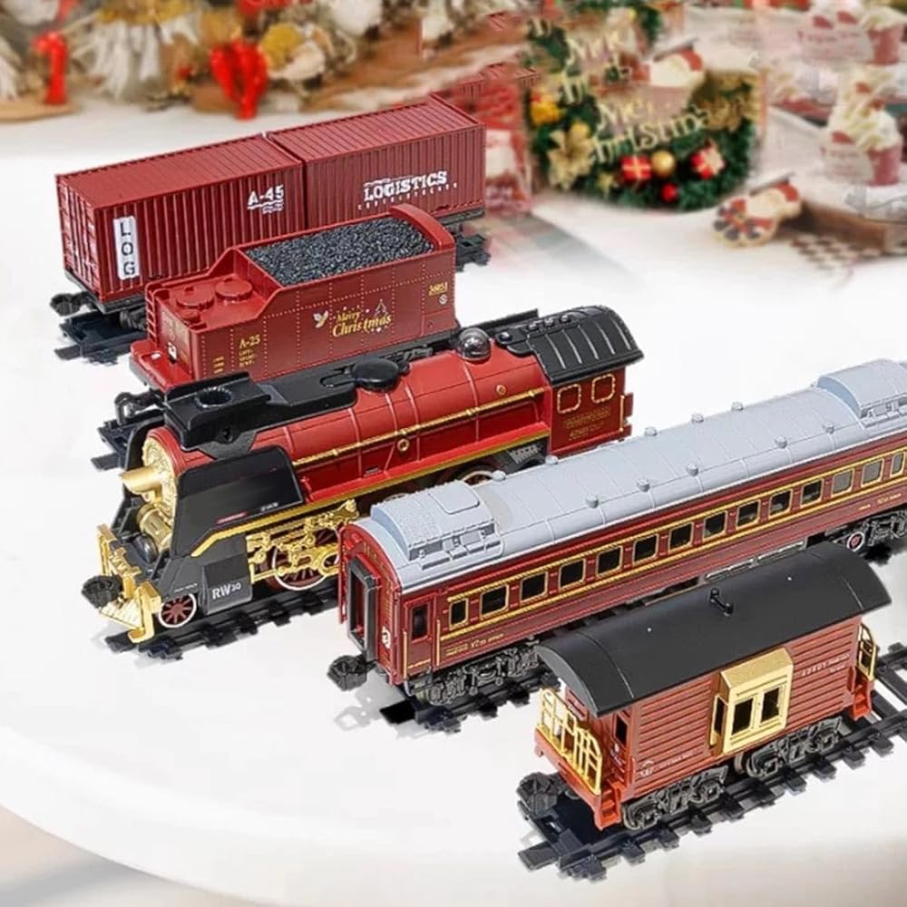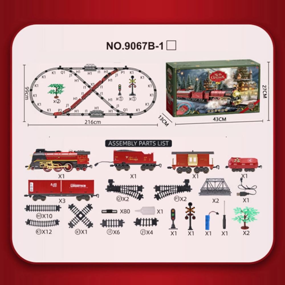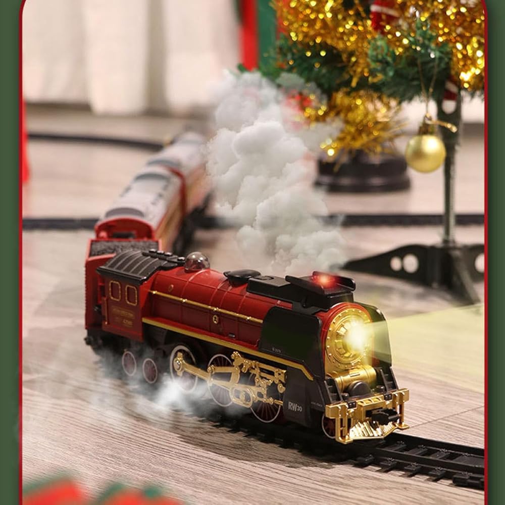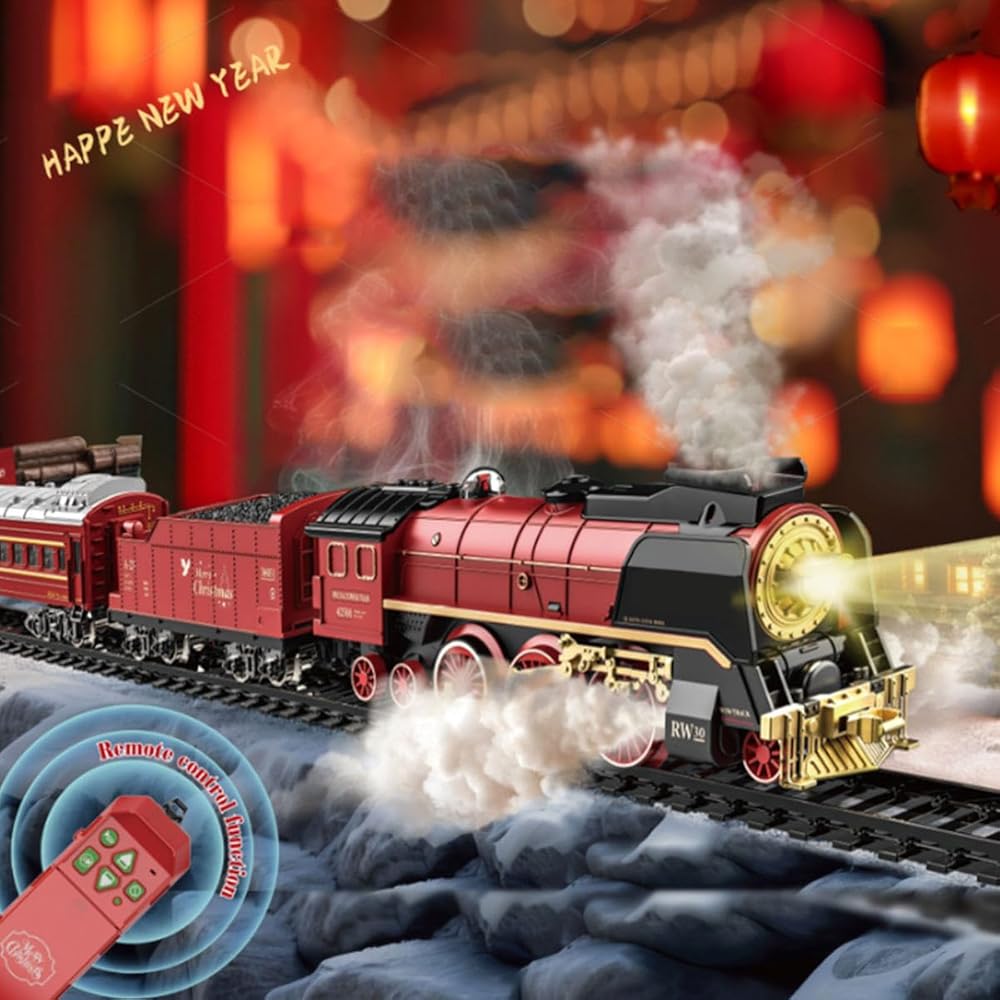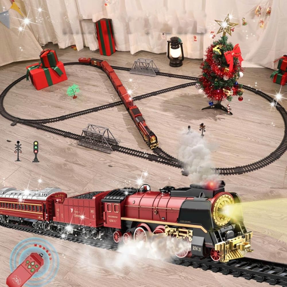 🎄 Complete Christmas Steam Train Set: This electric train set includes everything you need for a festive and realistic railway experience — a remote controller, detailed steam locomotive, passenger car, coal car, freight car, long tracks, and Christmas-themed scenery cards. Perfect for creating a joyful holiday atmosphere and an engaging model setup for teens and adults.