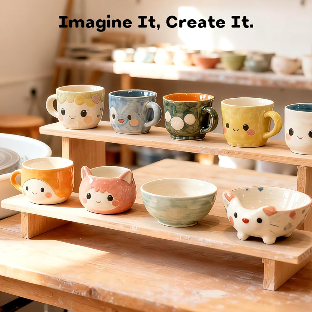 إمكانيات إبداعية لا حصر لها: قم بتدوير الفخار على العجلة أو تشكيل الطين يدويًا - حيوانات أو مزهريات أو منحوتات خيالية! يتيح الطين الناعم وسهل الاستخدام والدهانات الساطعة للأطفال إحياء أفكارهم الأكثر جموحًا.