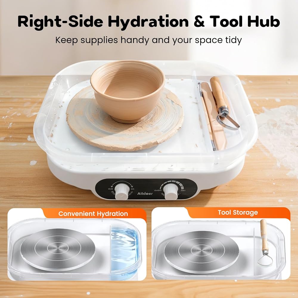 تصميم مدمج ومحمول: استمتع بحرية الإبداع في أي مكان باستخدام عجلة الفخار خفيفة الوزن وصغيرة الحجم. تصميمه المحمول يجعل من السهل تخزينه ونقله، وهو مثالي للحرف اليدوية في المنزل أو في الفصول الدراسية أو أثناء التنقل.