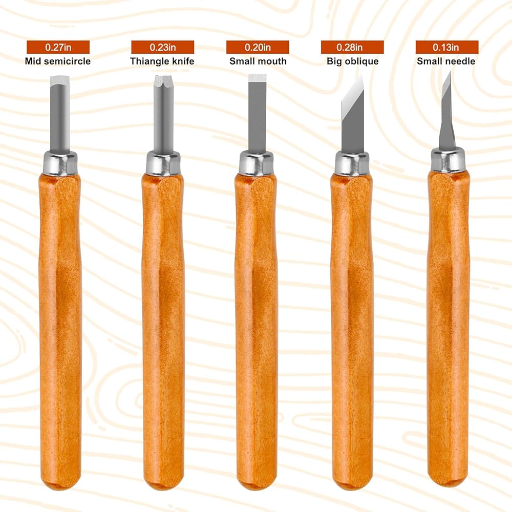 • [أدوات نحت متعددة الاستخدامات] - تتضمن مجموعة سكاكين نحت الخشب هذه 5 قطع من الأزاميل الخشبية، كل منها لها شكل شفرة فريد مصمم لمهام تفصيلية مختلفة، مما يسمح لك بتحقيق نحت دقيق على مواد مختلفة مثل الخشب والصابون والمشمع والمطاط والقرع.