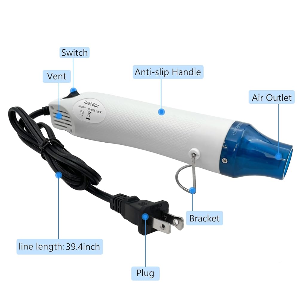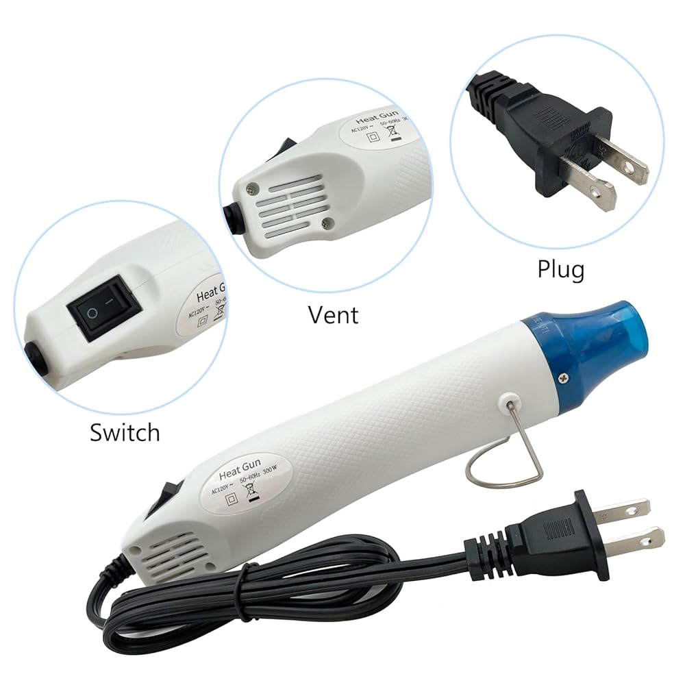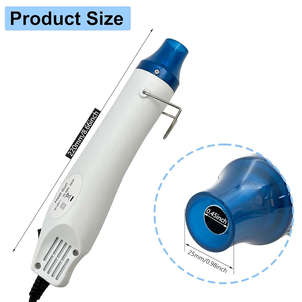 Easy to Operate: When using the heat gun, just press the button to open it, keep the nozzle 5-6cm distance from your items and better to heat it at about at 45 degree angle until completed. The temperature can not be adjusted.