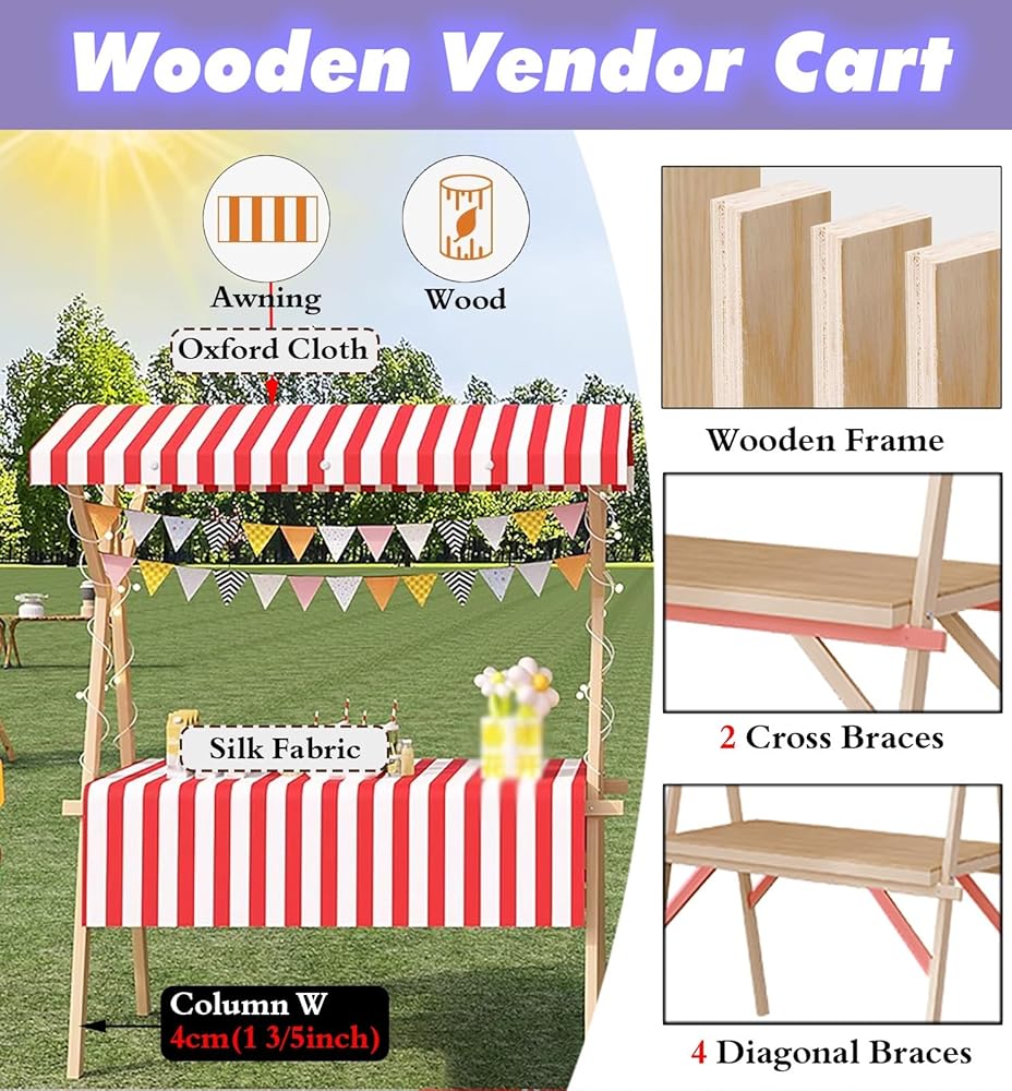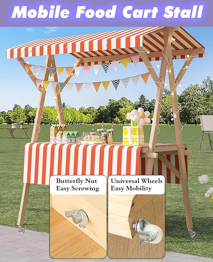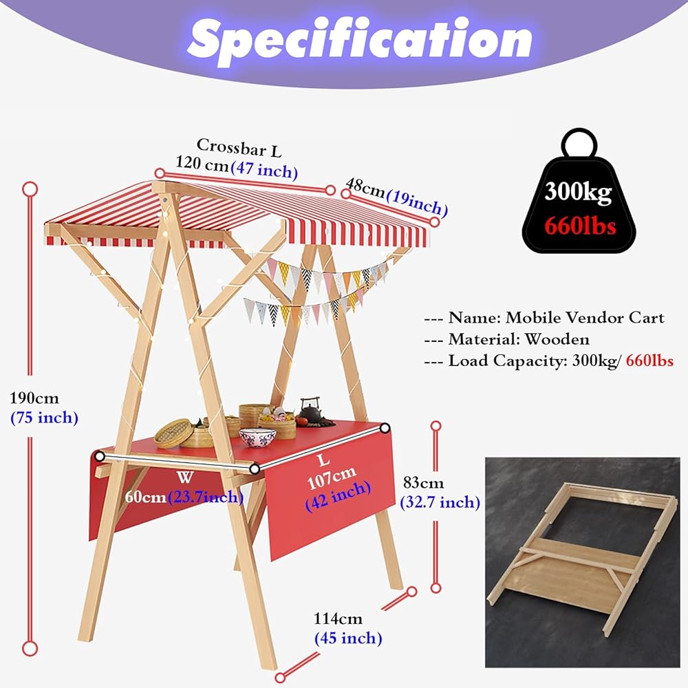 • Wooden Vendor Cart: Built to last, our Wood Stall Stand features a thickened tabletop and heavy-duty frame, with a wear-resistant design that withstands daily use while maintaining its sturdy, polished look