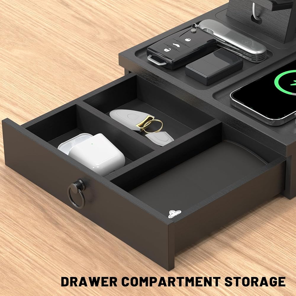 مساحة للدرج للتخزين: لا تقوم قاعدة شحن الهاتف الخاصة بنا بشحن الأجهزة الإلكترونية فحسب، بل توفر أيضًا مساحة لتنظيم الأساسيات. ويتميز منظم السرير الرجالي هذا بدرج مخفي مكون من ثلاثة أقسام لتخزين أدواتك الصغيرة بسهولة. تلبية احتياجاتك اليومية.