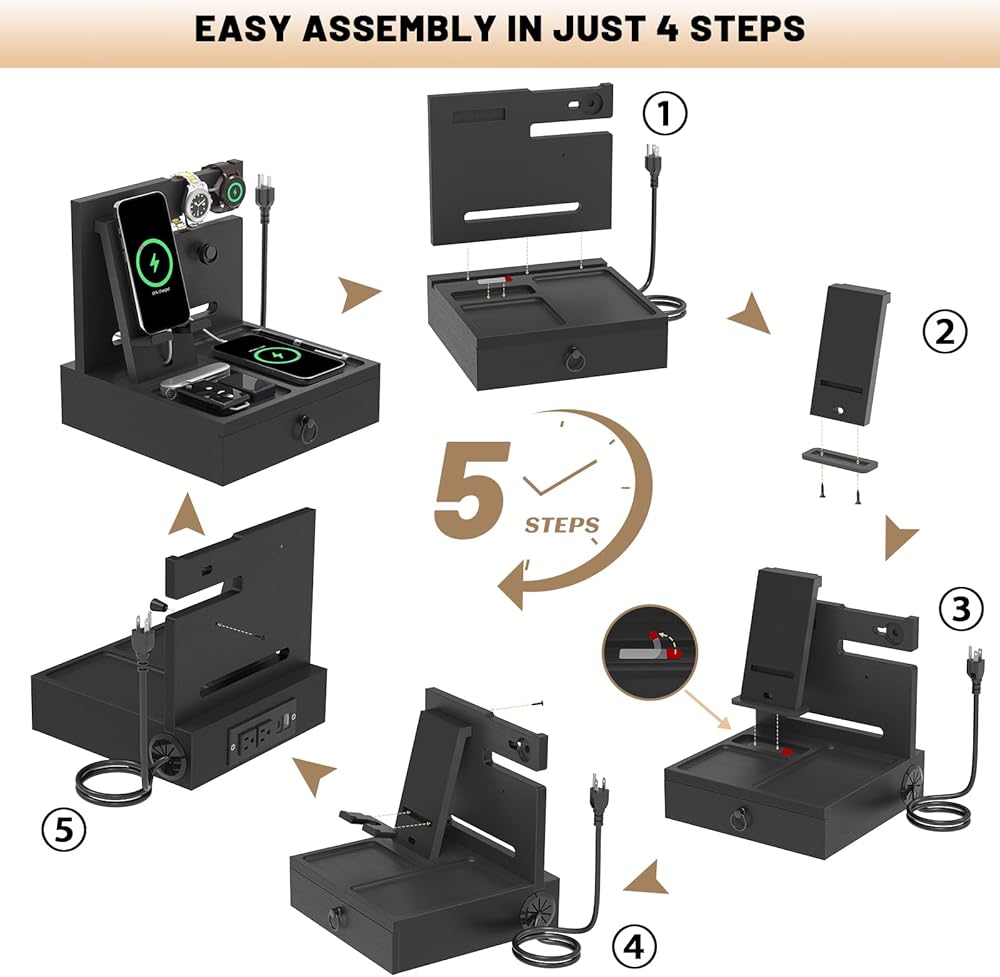 قاعدة شحن مدمجة في الجانب الخلفي: مع 2 منافذ تيار متردد، ومنفذي USB (النوع A والنوع C)، تعد قاعدة الشحن هذه مثالية لشحن أجهزتك الإلكترونية. تضمن محطة الشحن المدمجة المخفية الجمال وتجعل منظم الطاولة مناسبًا لغرفة النوم والمكتب والخزانة وغرفة المعيشة.