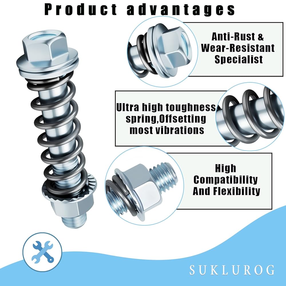 【Shock Absorbing Spring】: This car bolt is different from similar products in the market,This car bolt kit is equipped with a unique vibration-damping spring, which has excellent damping performance. It can absorb some vibration, protect bolts from loosening during use, and ensure a stable connection, which can effectively reduce the impact of vibration on fixed components and extend the service life of components. In addition, in high-temperature environments, bolts with springs can compensate for this change by compressing or stretching the spring, maintaining the sealing and stability of the system.