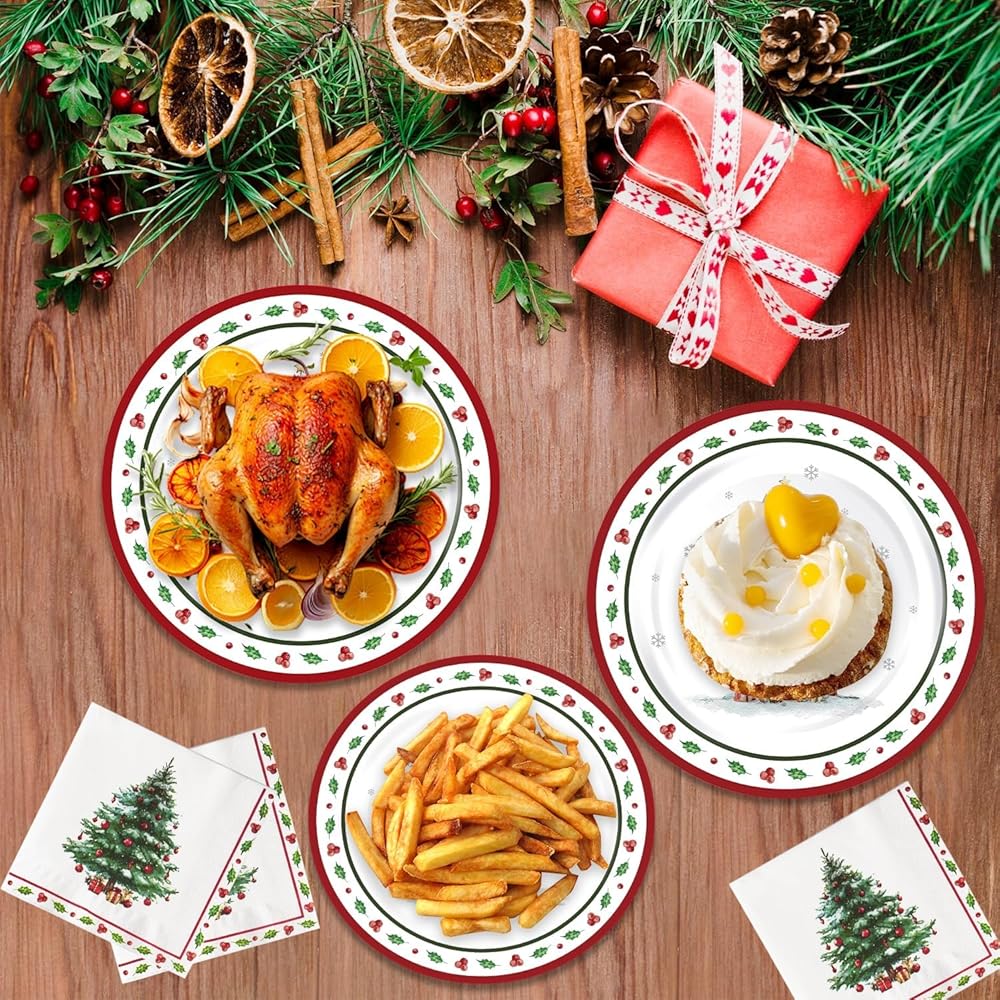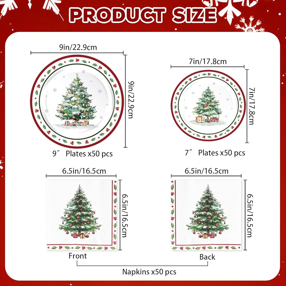 Christmas Party Supplies: You will get 150pcs Christmas paper plates and napkins set, including 50pcs 9" dinner plates, 50pcs 7" dessert plates, and 50pcs napkins. The holly berries pattern can perfectly match your Christmas party decorations, and the large quantity of 50 meets the needs of large parties and gatherings, making it a great helper for your family gatherings and banquets
