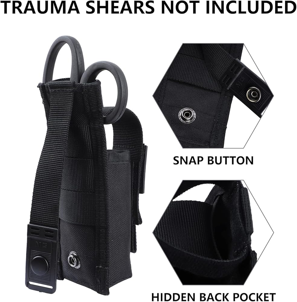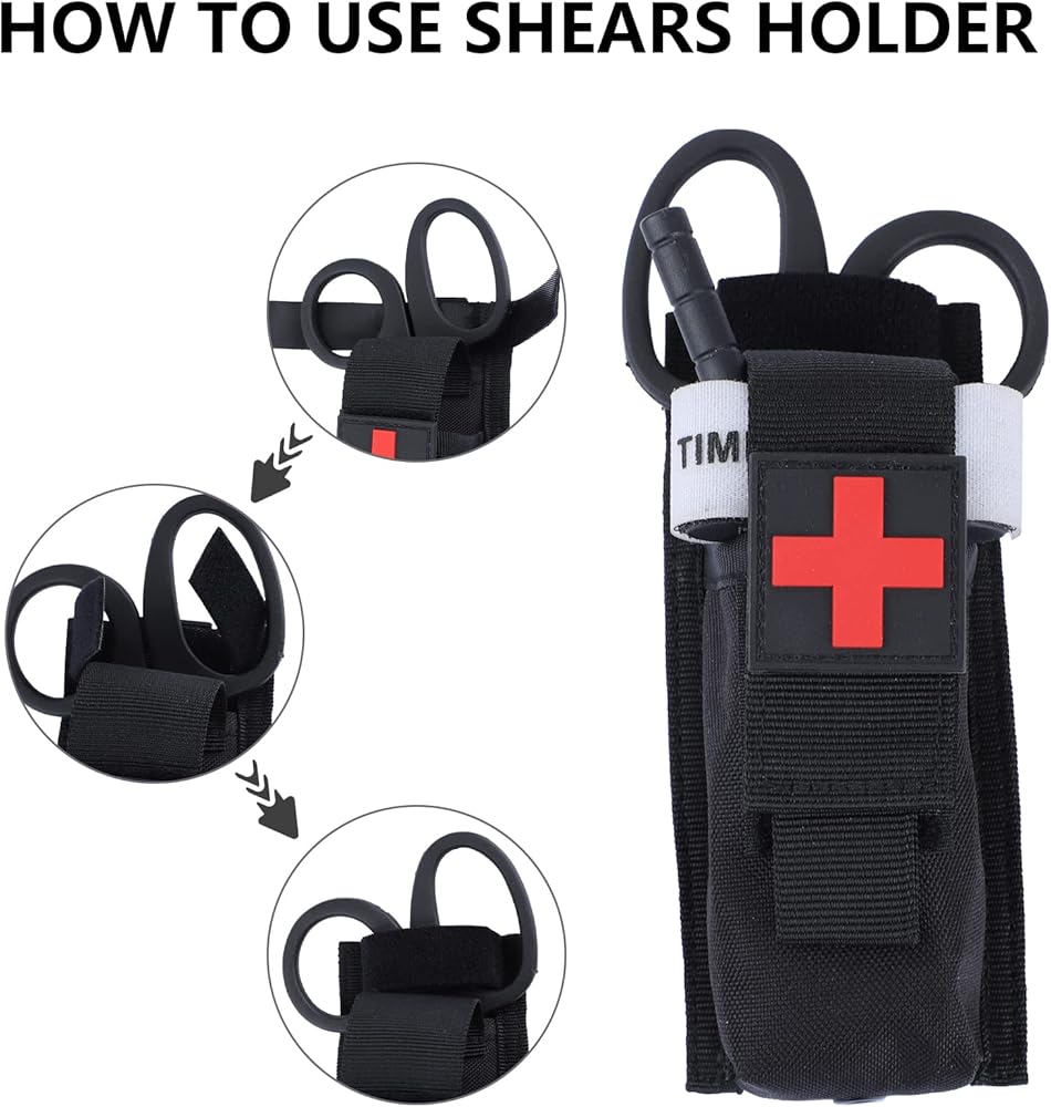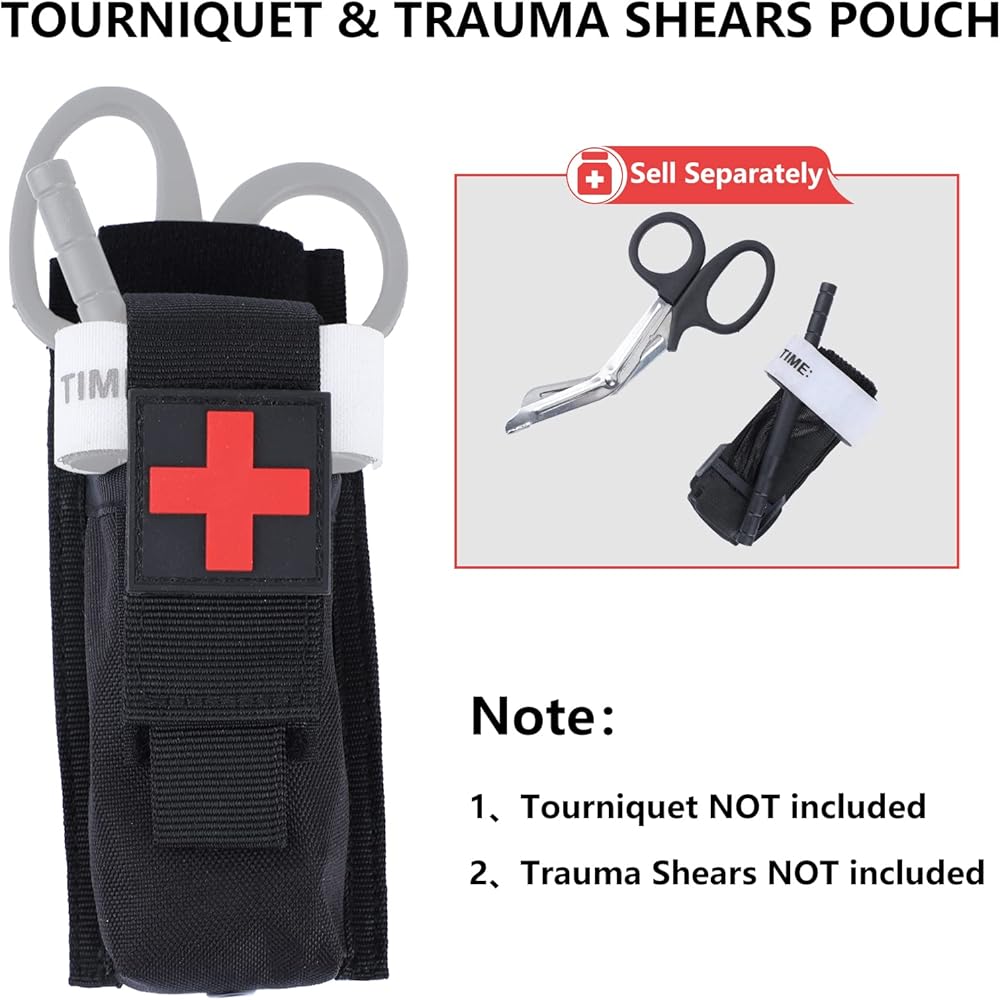 Easy to use - One hand application. Main compartment with pull tab on cover enables rapid access to your tourniquet in any situation,while a hidden back compartment with hook and loop closure enables quick and easy deployment of your trauma shears (tourniquet and shears are not included)