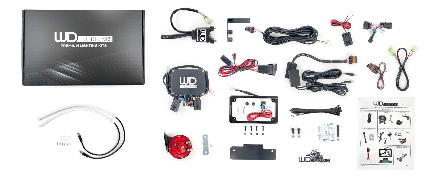 يشتمل على: مجموعة إشارة الانعطاف للتوصيل والتشغيل مع جميع التوصيلات المطلوبة لجهازك لدمجها في المصابيح الخلفية الخاصة بك. ساحرة إشارة الانعطاف المثبتة على عمود التوجيه في المصنع. أضواء أمامية مميزة، طقم بوق (مفتاح متأرجح للوحة القيادة)، مجموعة أسلاك للدمج في لوحة ترخيص LED من الألومنيوم من مجموعة الأدوات (تلائم لوحة مقاس 4x7 بوصة)، وتعليمات