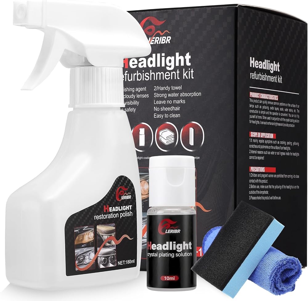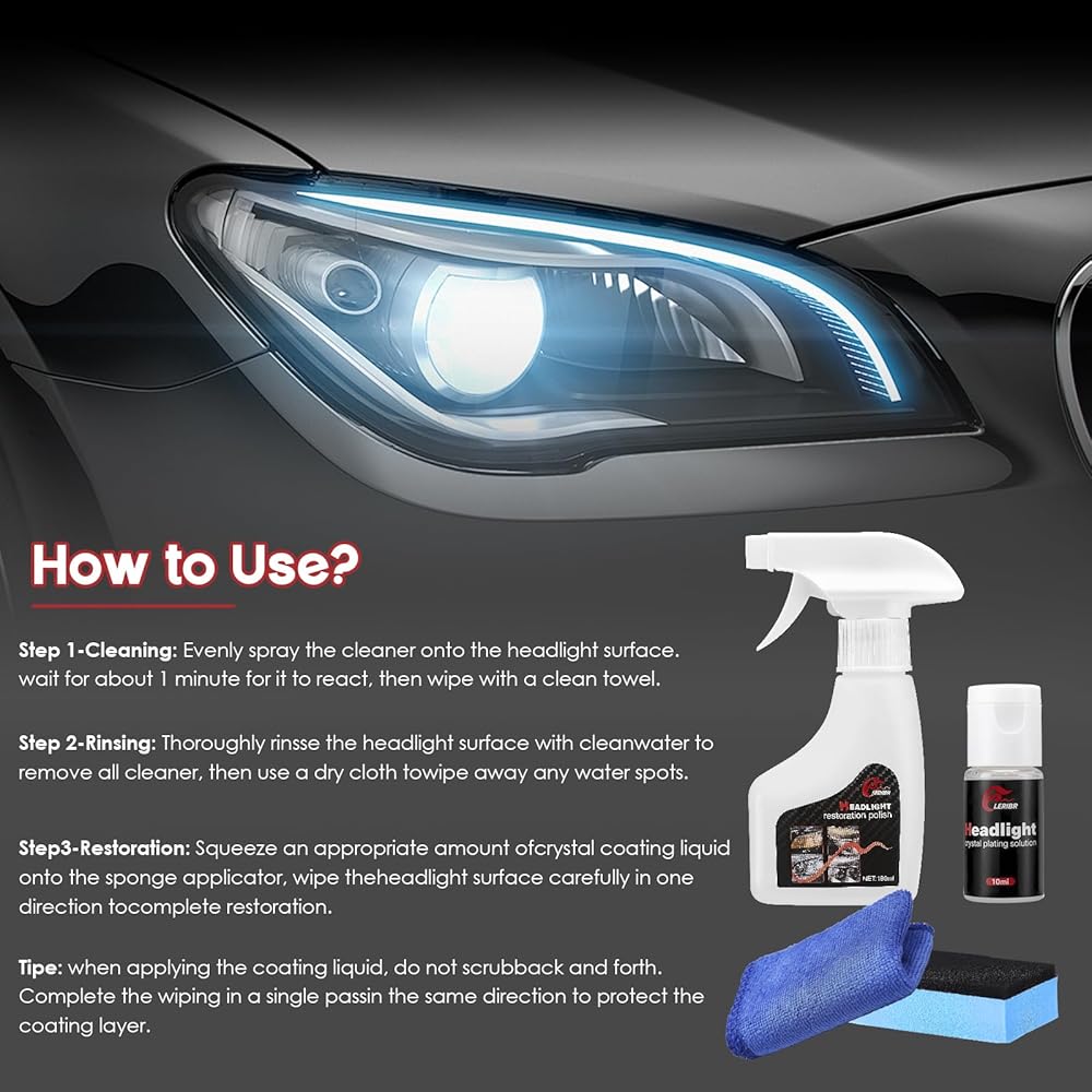 pecifications: Product Name: Car Headlight Repair Fluid Kit Shelf Life: 3 Years Packaging Weight: 300g Packaging Size: 8.5*7*14.5cm Color: As shown in the picture Contents: 1 * 180ml Repair Fluid 1 * 10ml Coating Agent 1 * Towel 1 * Cleaning Sponge Instructions: 1. Spray the repair fluid onto the headlight, wait a few minutes, and then wipe clean with a towel. 2. After rinsing with clean water, apply the coating agent to the cleaning sponge and wipe the headlight. Notes: 1. Due to monitor and lighting differences, the actual product color may vary slightly from the image. Thank you! 2. Due to manual measurement, please allow slight size deviations. About Service: We value every customer's suggestions and feedback and will provide excellent service. If you are not satisfied with the product after receiving it, please feel free to contact us.