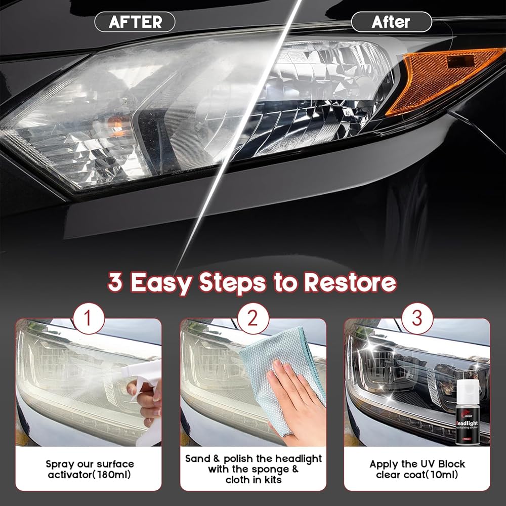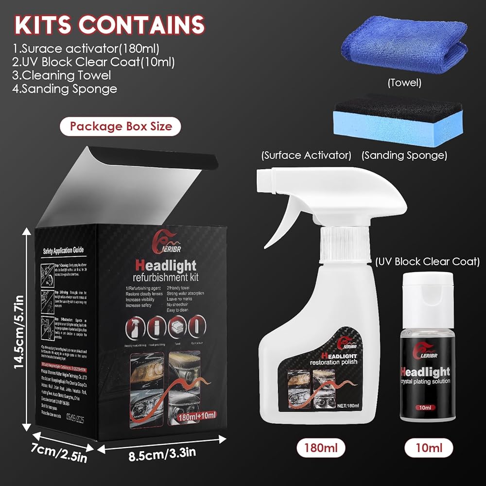 【COMPLETE KIT】Professional headlight restoration kit includes refurbishing agent, cleaning towel, and application accessories for comprehensive lens repair