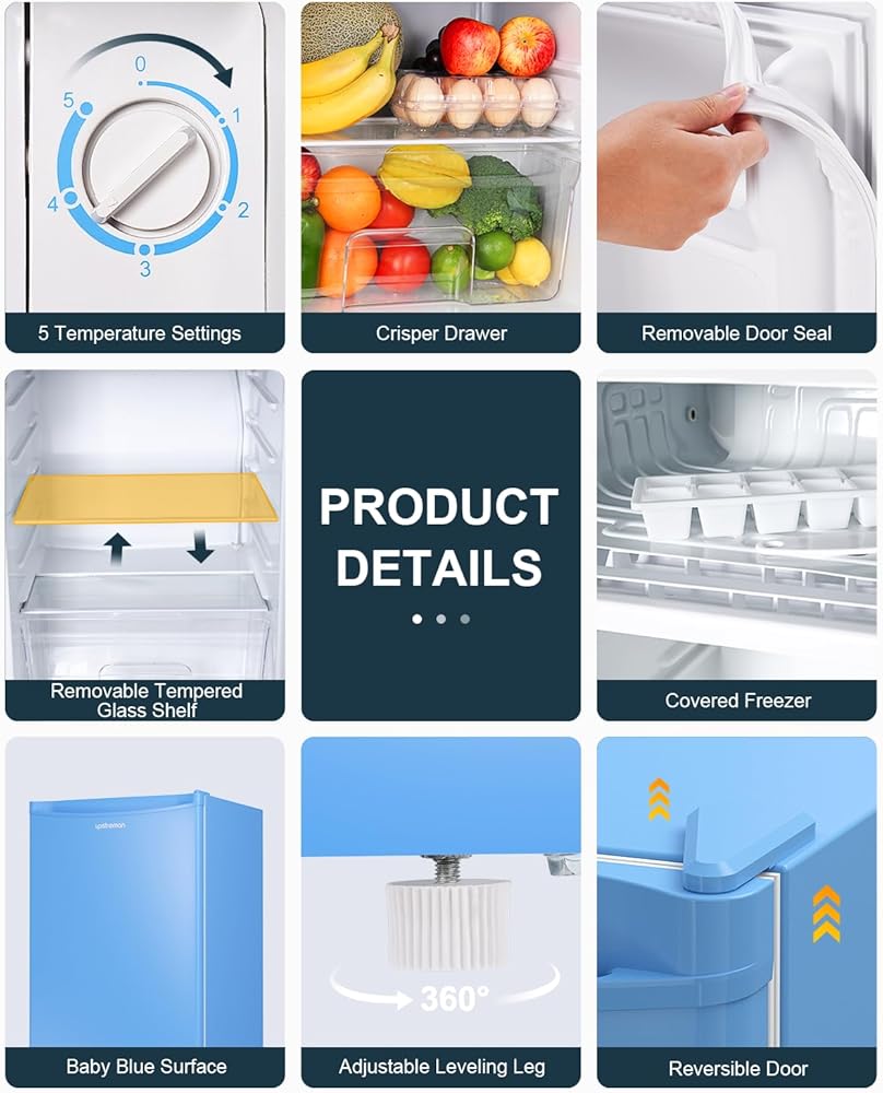 Upstreman 3.2 Cu.ft Mini Clim مع الفريزر ، ثلاجة صغيرة من الباب ، ثلاجة مسكن ، ترموستات قابلة للتعديل ، ثلاجة صغيرة لغرفة النوم ، المكتب ، المسكن ، الأزرق BR321