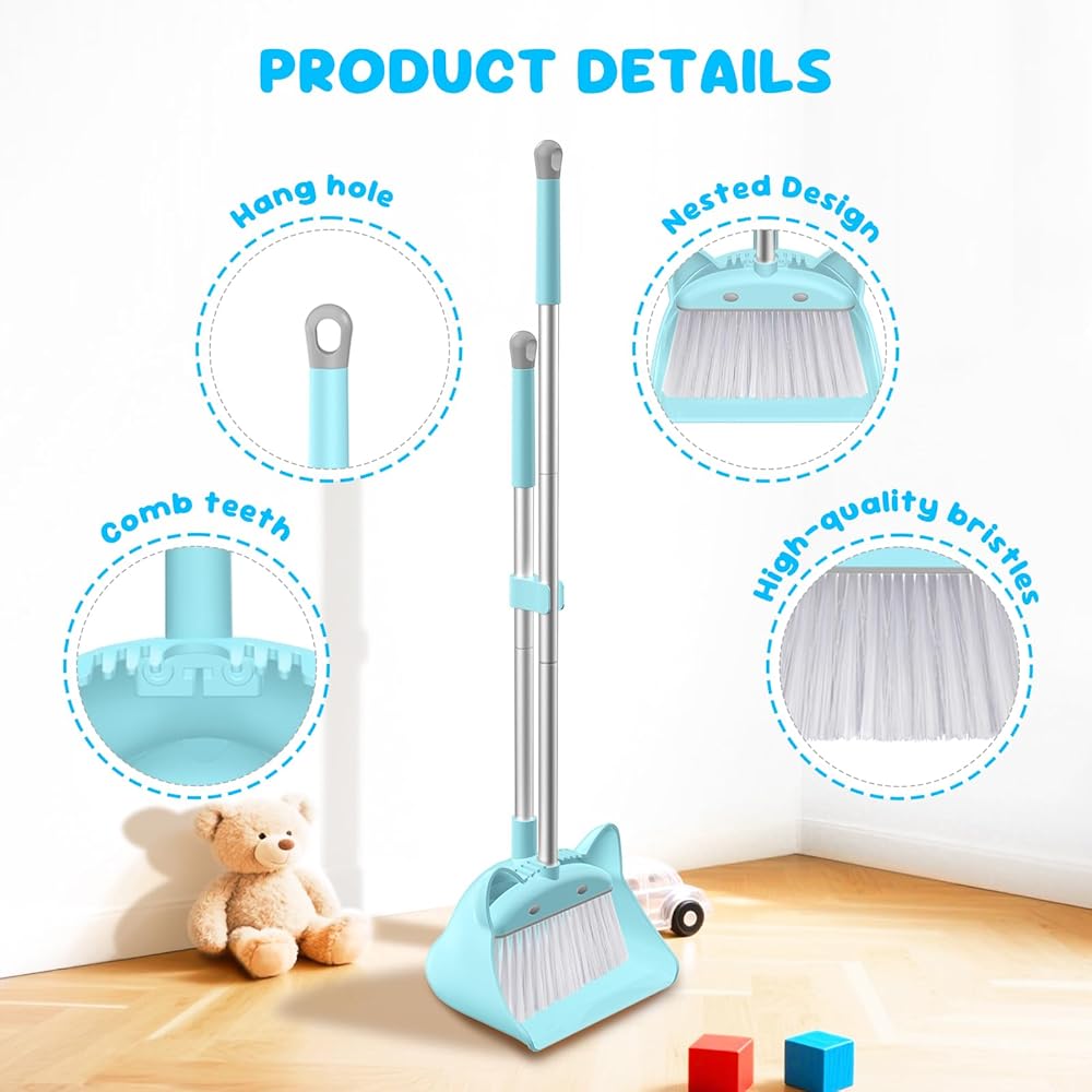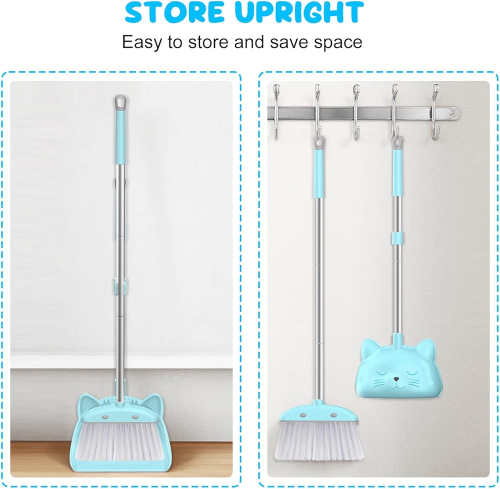 سهلة التخزين: تحتوي المكنسة الصغيرة المزودة بمجرفة للأطفال على قفل سريع متداخل وفتحات تعليق لسهولة التخزين وتوفير المساحة. ويمكن أيضًا تخزينها في وضع مستقيم.