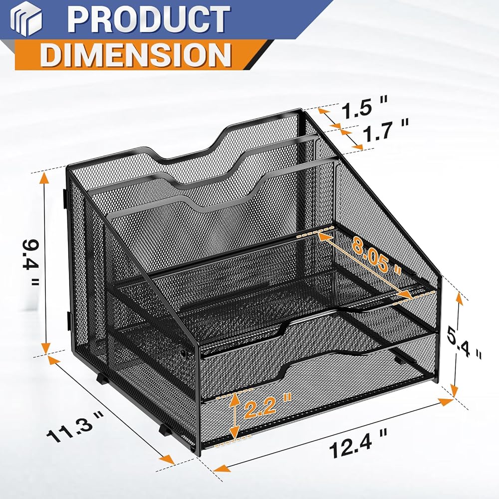 - الأبعاد: 12.4 بوصة طول × 11.3 بوصة عرض × 9.4 بوصة ارتفاع، كل صينية أفقية: 12.4 بوصة × 8.05 بوصة × 2.2 بوصة (الطول × العرض × الارتفاع)؛ 2 حامل ملفات: 12.4 بوصة × 9.4 بوصة × 1.5 بوصة (الطول × الارتفاع × العرض)