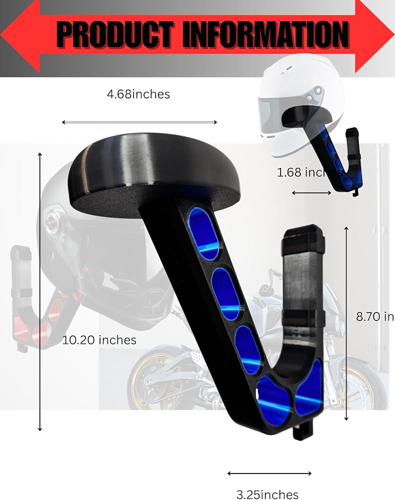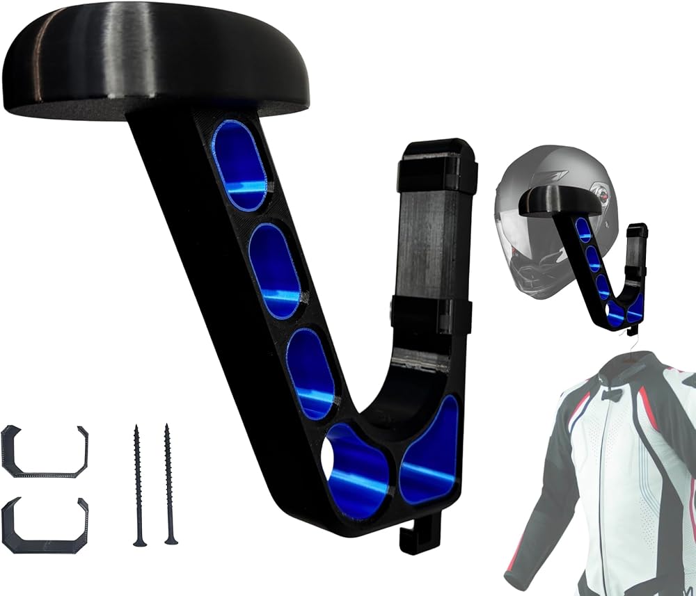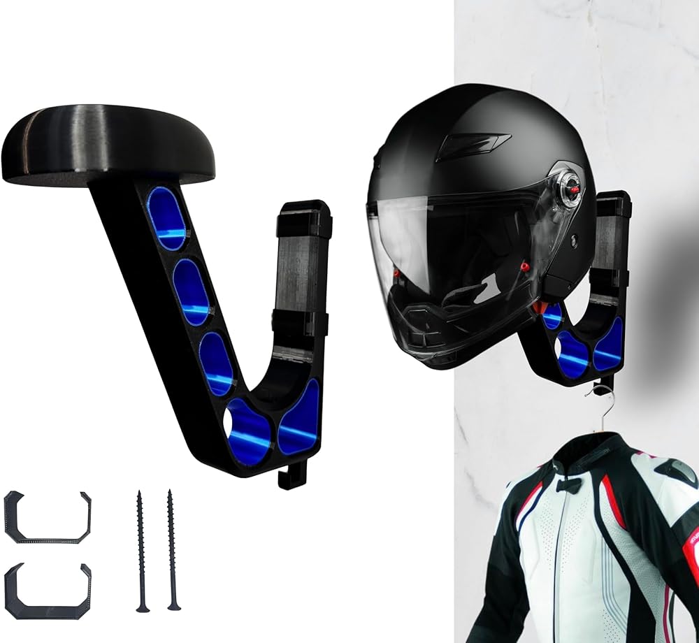 *This wall-mounted hook offers a modern and practical solution for safely storing motorcycle, bicycle, sports, or VR/gaming helmets. The angled support arm and large top platform ensure balanced weight distribution, reducing pressure points and helping to maintain your helmet's shape. Whether you're optimizing your garage, gaming station, or entryway, this hanger brings strong support with a sleek, minimalist profile. Motorcycle helmet wall hook, 3D printed helmet mount, helmet storage rack. *This premium wall-mounted helmet hanger is a thoughtful blend of practical engineering, modern aesthetics, and everyday convenience, designed to transform the way you store and display headgear. Crafted using advanced 3D printing techniques and finished in a rich sapphire blue, this hanger provides a reliable, elegant solution for holding motorcycle helmets, bicycle helmets, football helmets, and even large gaming headsets. Whether you want to free up floor space in a crowded garage, create an organized entryway, protect an expensive helmet from scratches and dings, or put your favorite headset on display in a gaming room, this hanger addresses those needs with a refined balance of strength, form, and ease of use. *In summary, this wall-mounted helmet hanger offers a combination of heavy-duty performance and refined design. Its 3D printed build ensures strength without bulk, the universal cradle accommodates a wide range of helmets and headsets, and the sapphire blue finish provides a modern accent that enhances any room. Easy installation, minimal maintenance, and the protective advantages of hanging rather than stacking or laying helmets on surfaces add to the overall value. Whether the goal is to organize a busy garage, streamline an entryway, protect an expensive helmet, or display a favorite headset with pride, this hanger provides a simple, elegant, and dependable solution that improves daily routines and preserves important equipment.