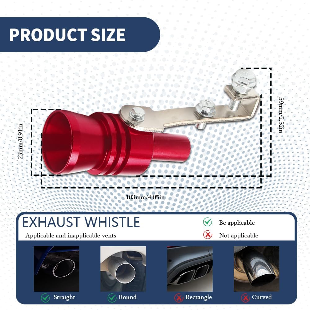 [Wide application] : The turbo whistle for exhaust pipe measures 4.05 x 2.32 inches and can be used in most cars, trucks, SUVs, bicycles, scooters and motorcycles with direct exhaust pipes. Please check the size carefully before purchasing