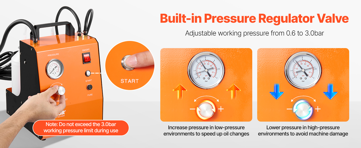 • ضغط قابل للتعديل: يمكن تعديل الضغط بين 0.6 إلى 3.0 بار. قم بزيادة الضغط في إعدادات الضغط المنخفض لتشغيل أسرع، أو خفض الضغط في بيئات الضغط العالي لتجنب تلف الخزان. يسمح مقياس الضغط البصري بمراقبة الضغط بسهولة.