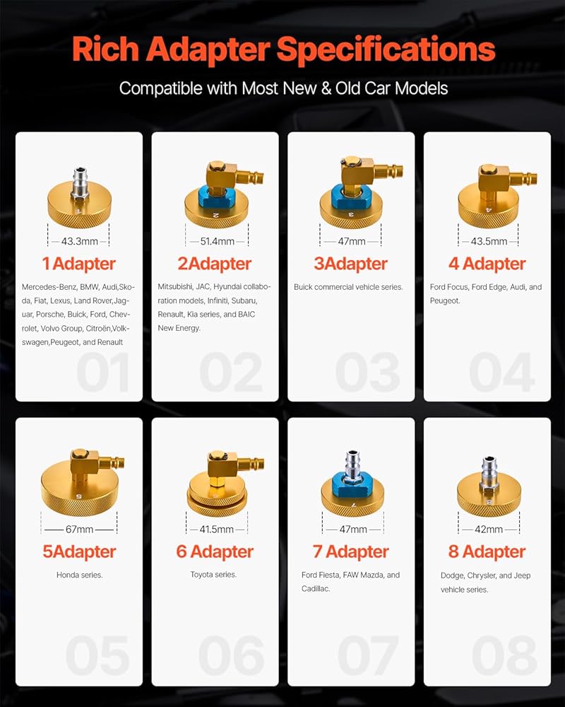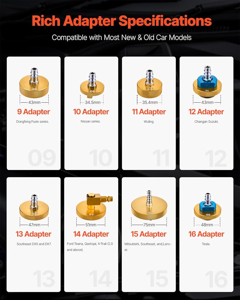 • تطبيق واسع: تشتمل مجموعة استبدال سائل الفرامل الكهربائية على موصل واحد و16 محول أسطوانة رئيسية، كل منها مصمم بأحجام محددة لتناسب مجموعة واسعة من نماذج المركبات. وهذا يضمن التوافق مع العديد من السيارات، سواء المحلية أو المستوردة، مما يجعله حلاً مثاليًا لمحلات تصليح السيارات وعشاق الأعمال اليدوية.