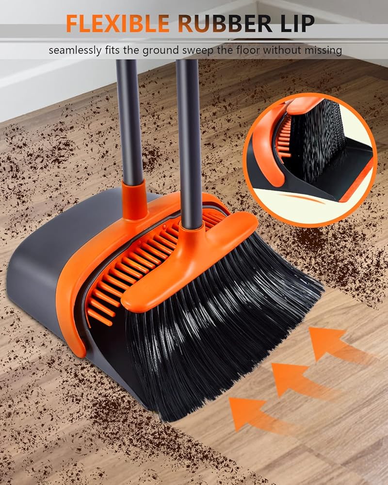 Comb Design Dustpan: The broom with dustpan combo set has a comb tooth design, which is convenient to scrape the hair and debris on the broom into the standing dust pan and broom combo, no need to drag by hand, easy to clean human hair/pet hair and dust on the broom.