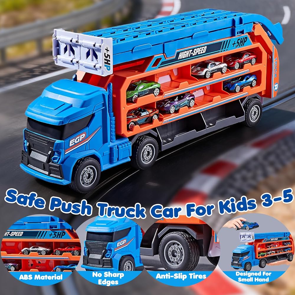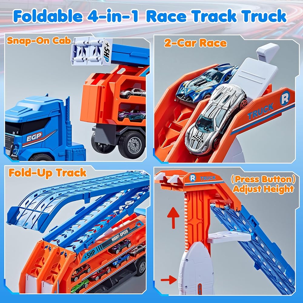 ألعاب شاحنة مضمار السباق للأطفال بعمر 3 4 5 6 سنوات - سيارة نقل شاحنة الناقل مع 6 ألعاب سيارات مصبوبة، شاحنة 4 في 1 مع مسارين سباق قابلين للطي، لعبة هدايا عيد الميلاد للأولاد الصغار، أزرق