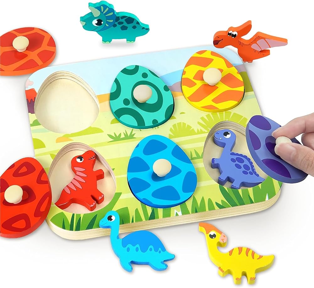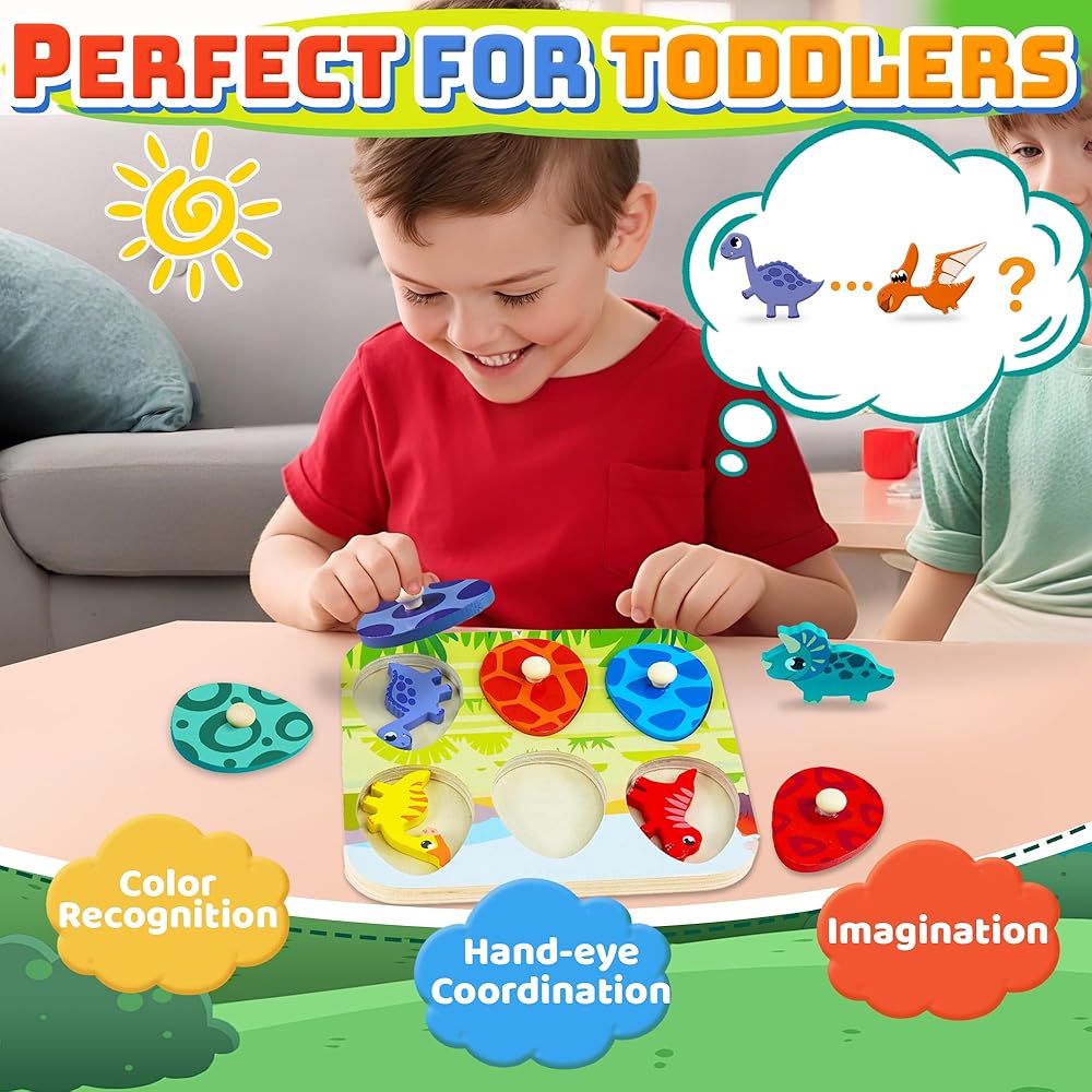 • مطابقة الألوان والمهارات الحركية الدقيقة: 6 بيضات ديناصورات وقطع الديناصورات المقابلة لها بألوان ثابتة زاهية وأشكال بسيطة. يبدأ الطفل الصغير الذي يبلغ من العمر عامين في التعرف على الألوان الأساسية والعلاقات المقابلة لها. يمكن أن تساعدهم "المطابقة منخفضة التعقيد" في بناء شعور بالإنجاز وتجنب الاستسلام بسبب الصعوبة المفرطة.