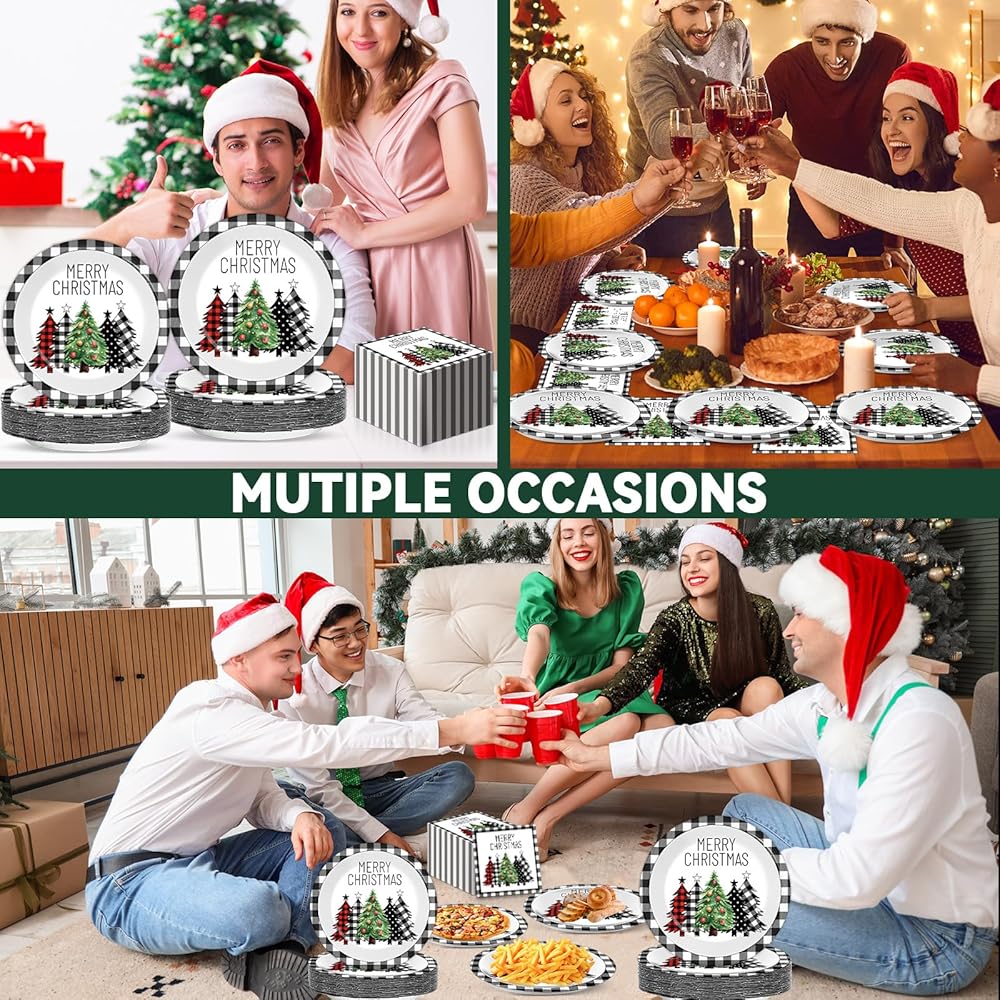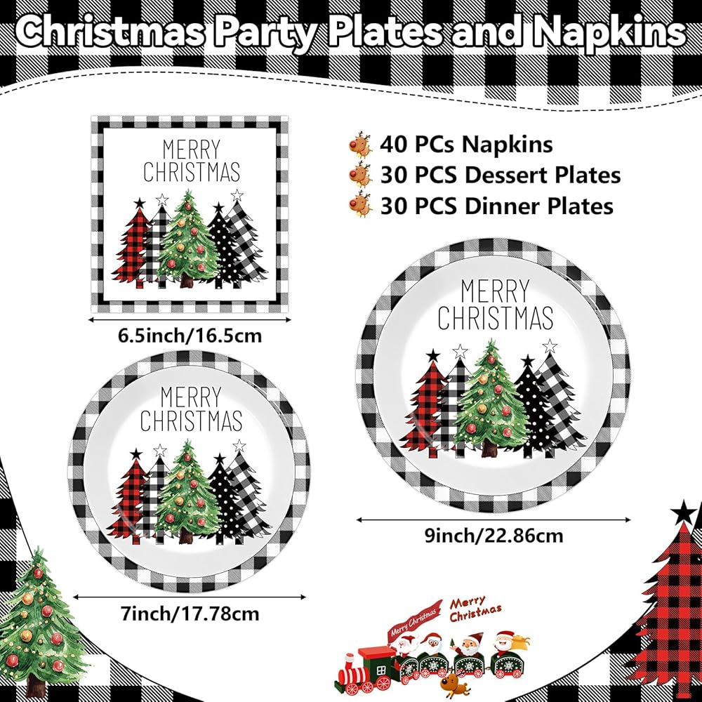 100 قطعة من أطباق ورق شجرة الجاموس المنقوشة لعيد الميلاد والمناديل باللون الأسود والأبيض لتزيين طاولة عيد الميلاد المجيد وأدوات المائدة للاستعمال مرة واحدة وأشجار عيد الميلاد لمستلزمات حفلات عيد الميلاد وعيد الميلاد